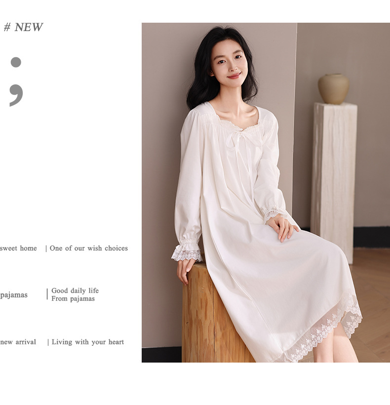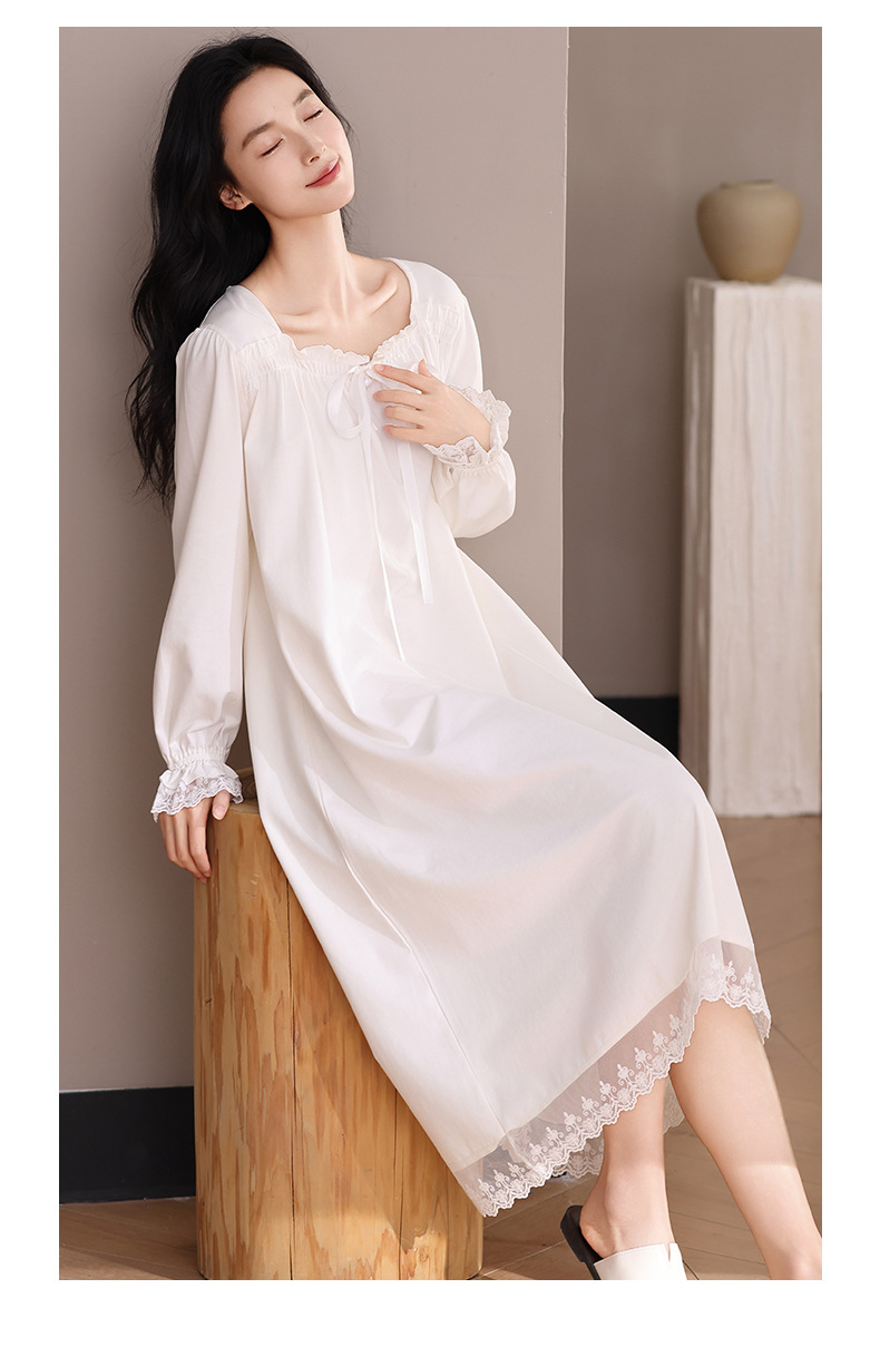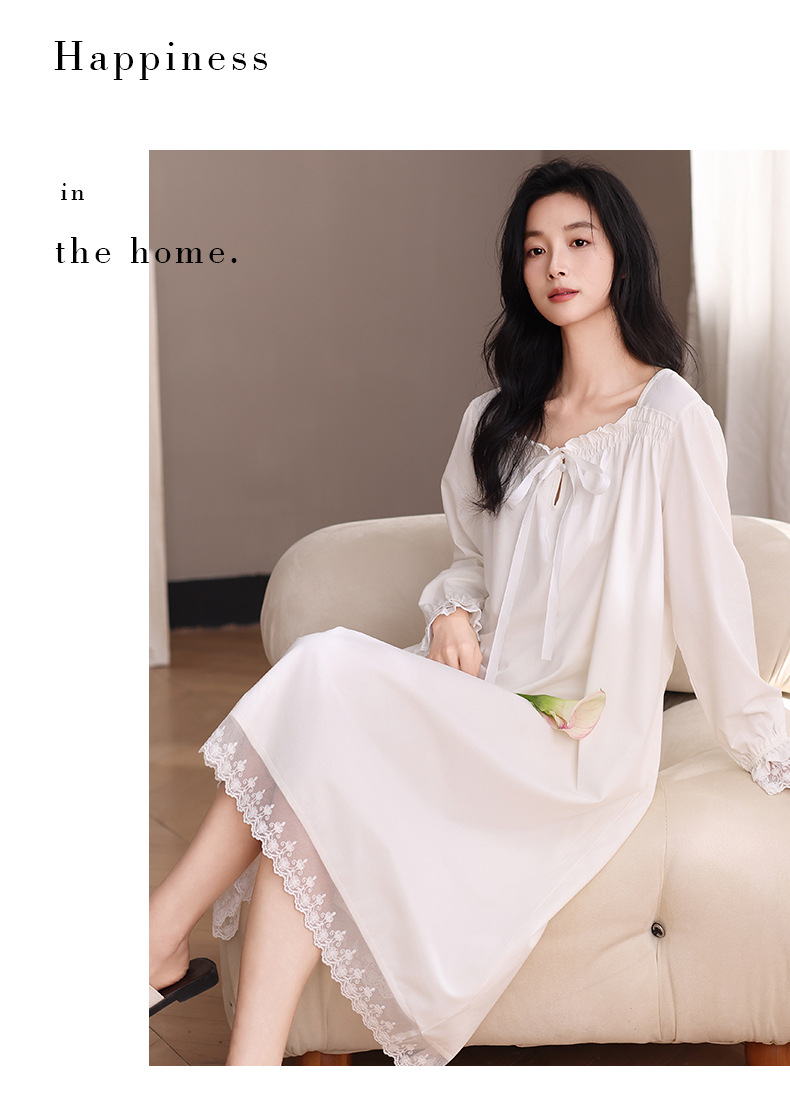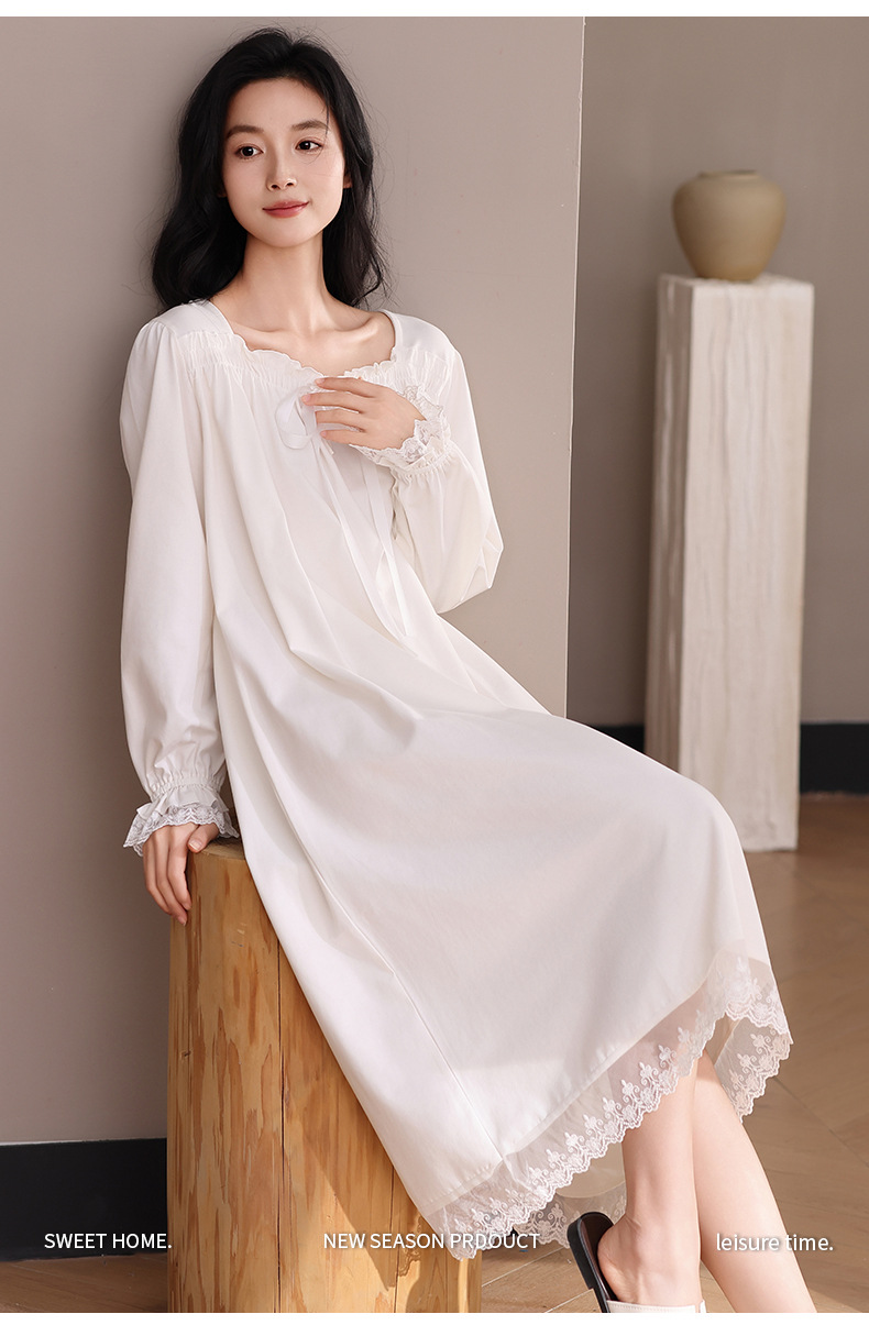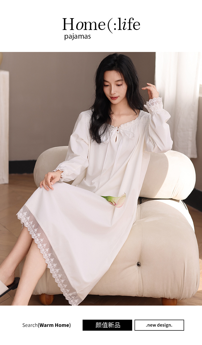 纯棉睡衣女长袖宫廷风睡裙春秋季新款女士V领长裙甜美宽松家居服