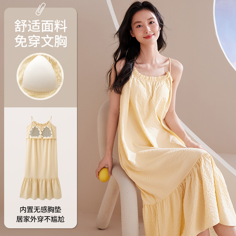 胸パッド付きの夏の女性のパジャマのサスペンダーの寝ているスカートのハスの葉の辺のシンプルな純色のさわやかな薄いタイプの家庭服の卸売り