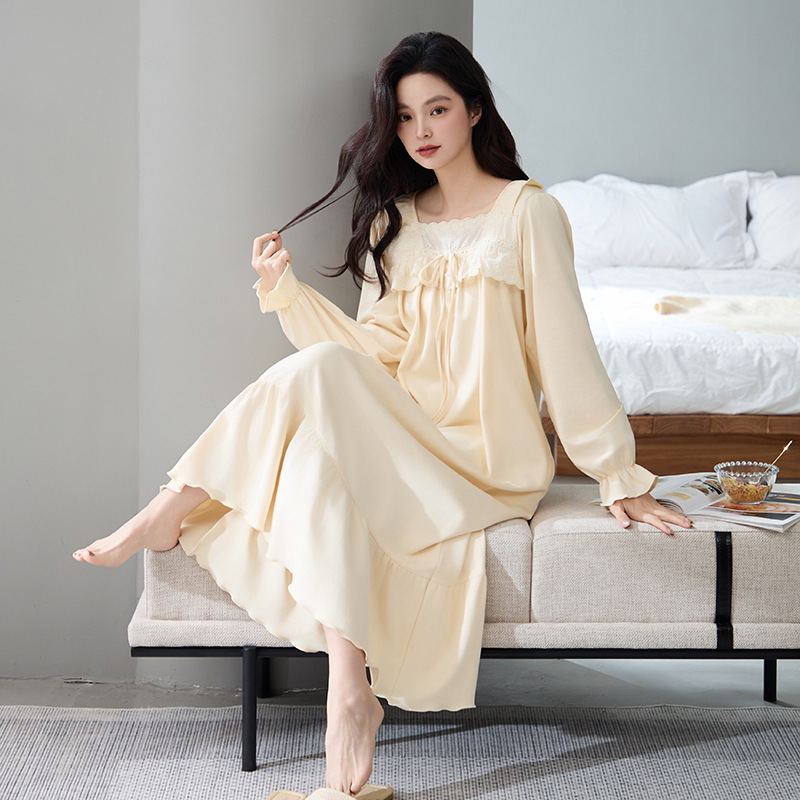 春と秋のナイトドレスレディースニットコットン長袖ワンピースパジャマ外に着ることができる高級感ゆったり大きいサイズロングスカートホームウェア