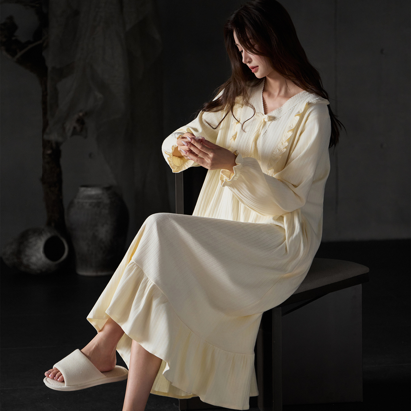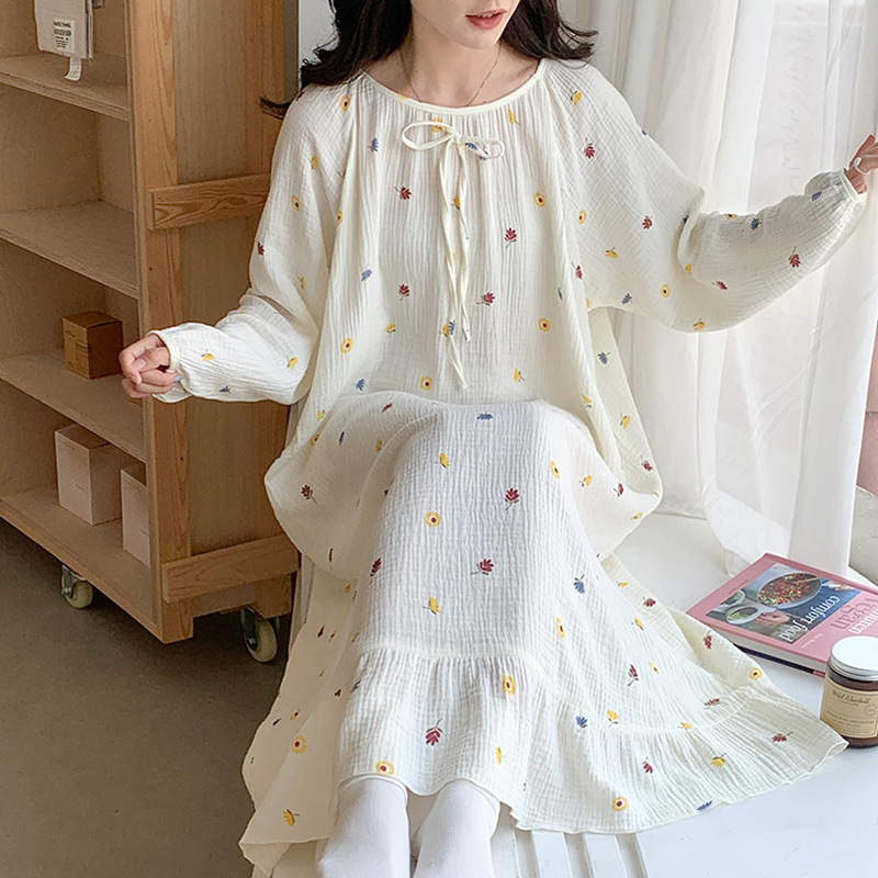 【100%纯棉】春秋季睡裙长袖开衫中长款连衣裙宽松睡衣女家居服