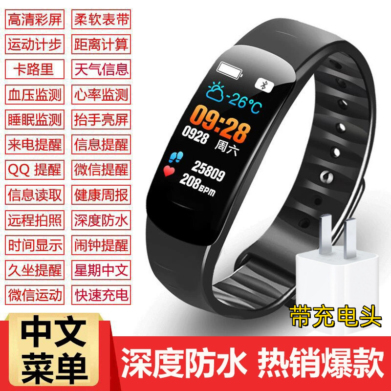 c1plus彩屏智能手环防水蓝牙计步测心率血压多功能运动手环跨境