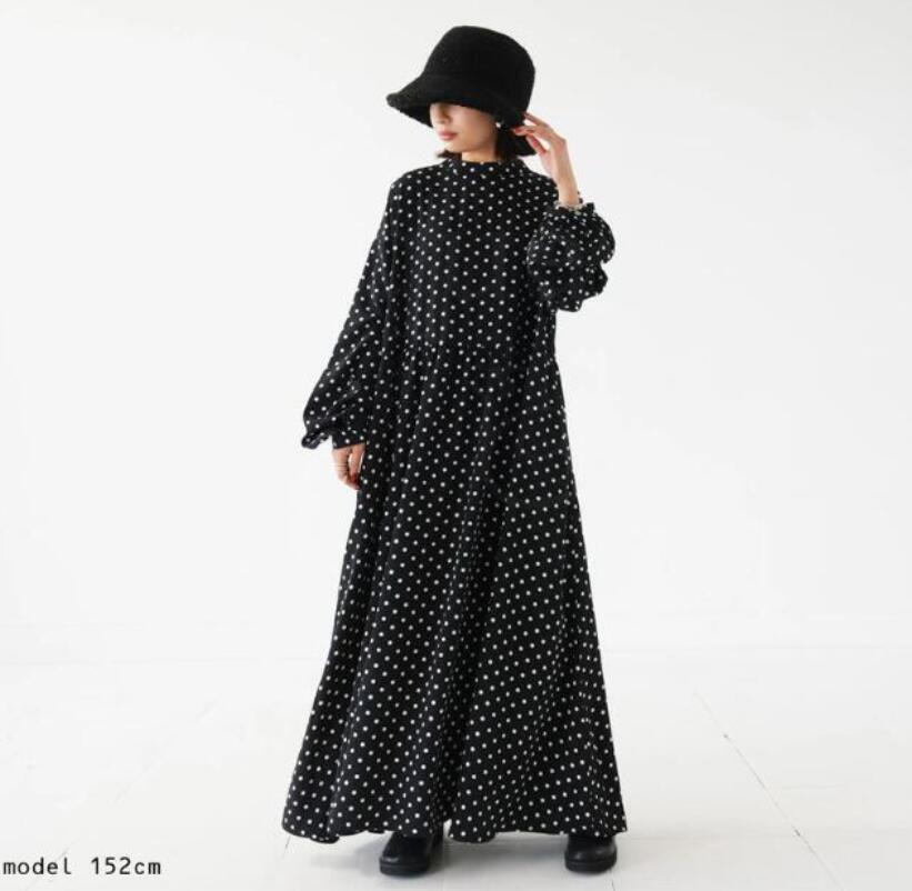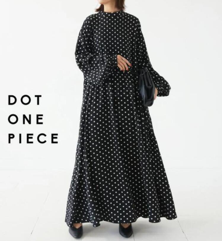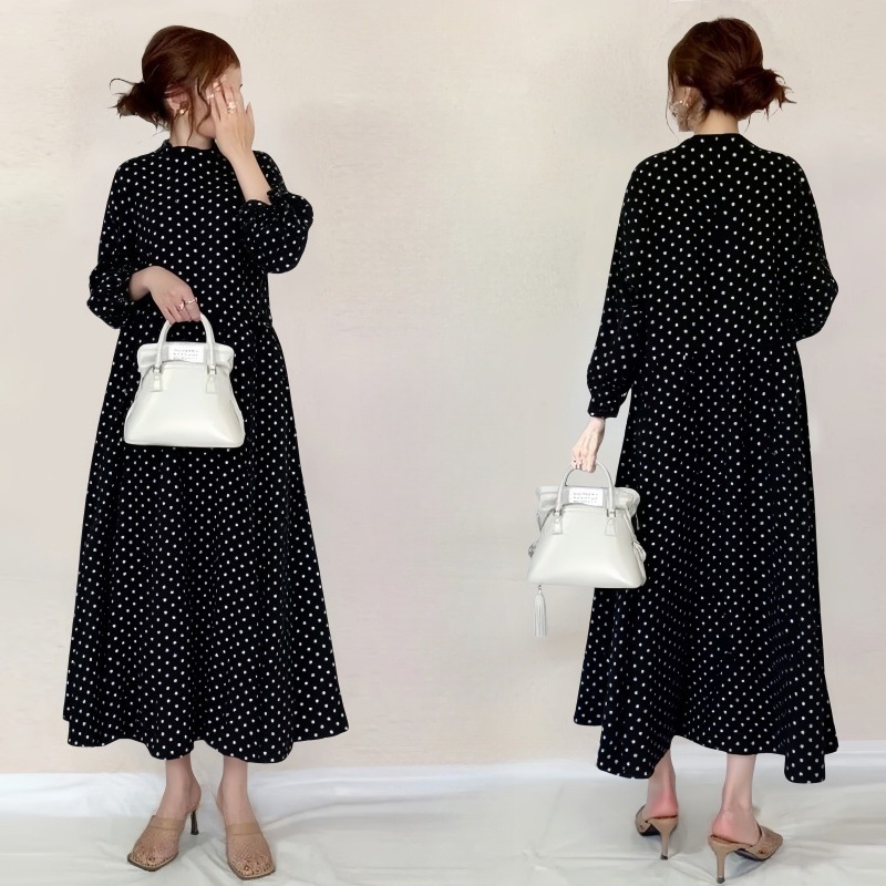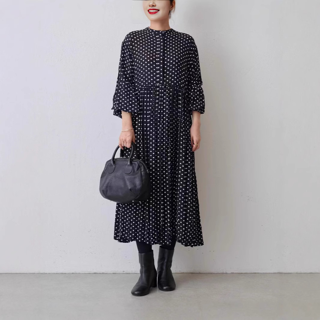 2024秋ロングラウンドネックプリーツ長袖水玉ドレス