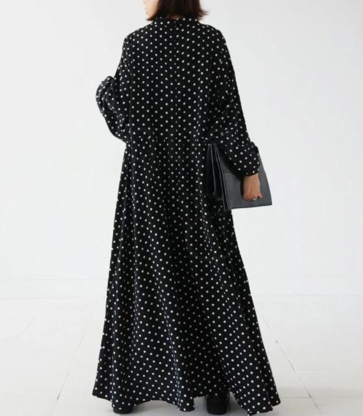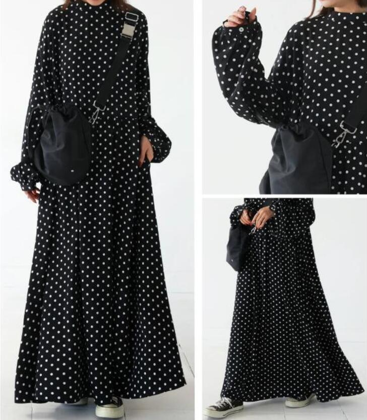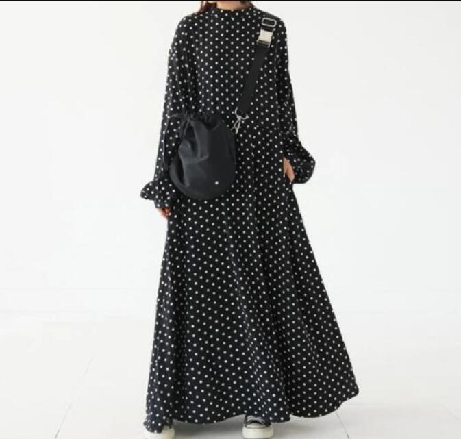 跨境外贸出口春秋宽松中长款黑色圆领压褶九分袖白波点大摆连衣裙