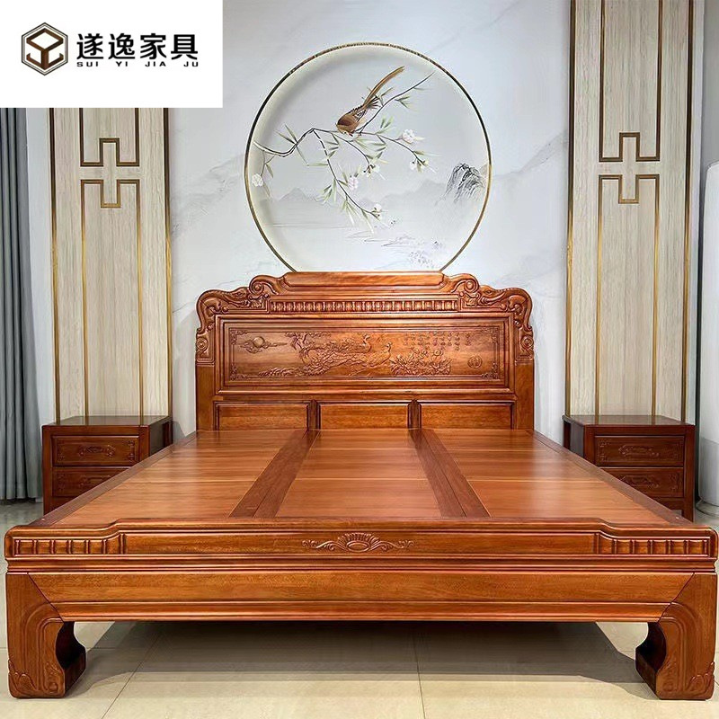 実木床ほぞ卯彫刻金花梨木全実木工芸ダブルベッド高級豪華紅木結婚ベッド