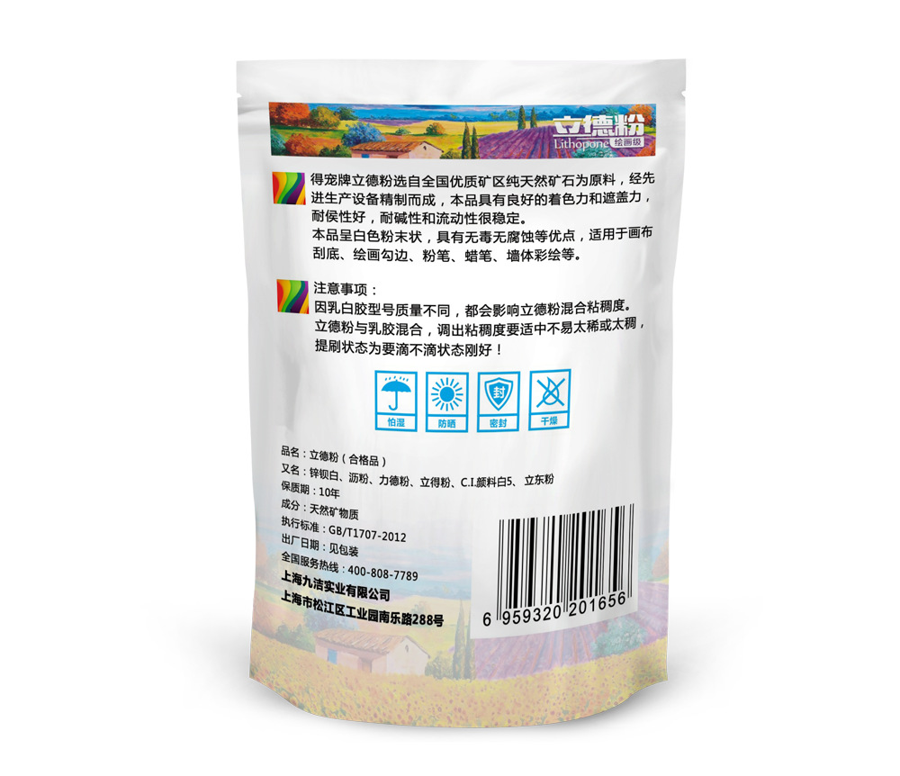 得宠牌立德粉选自全国优质矿区为原料,经先进生产设备精制而成,本产品有良好的着色力和遮盖力、耐侯性好、耐碱性和流动性很稳定。呈白色粉末状,无毒无腐蚀等优点。适用于画布刮底,绘画勾边,粉笔、蜡笔、墙体彩绘等。