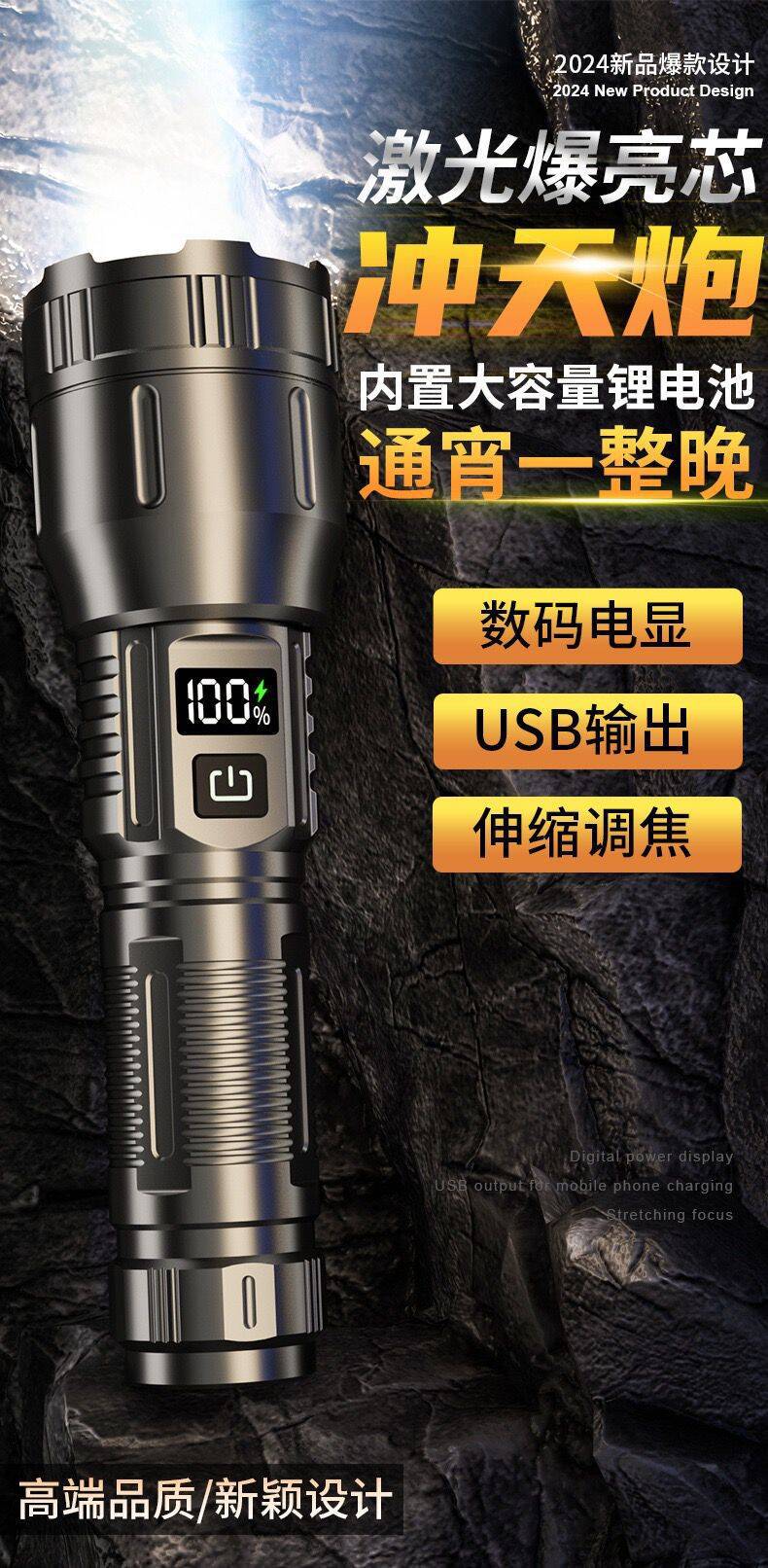 クロスボーダー新型強光遠射白レーザー懐中電灯伸縮ズーム電力量表示屋外緊急携帯懐中電灯