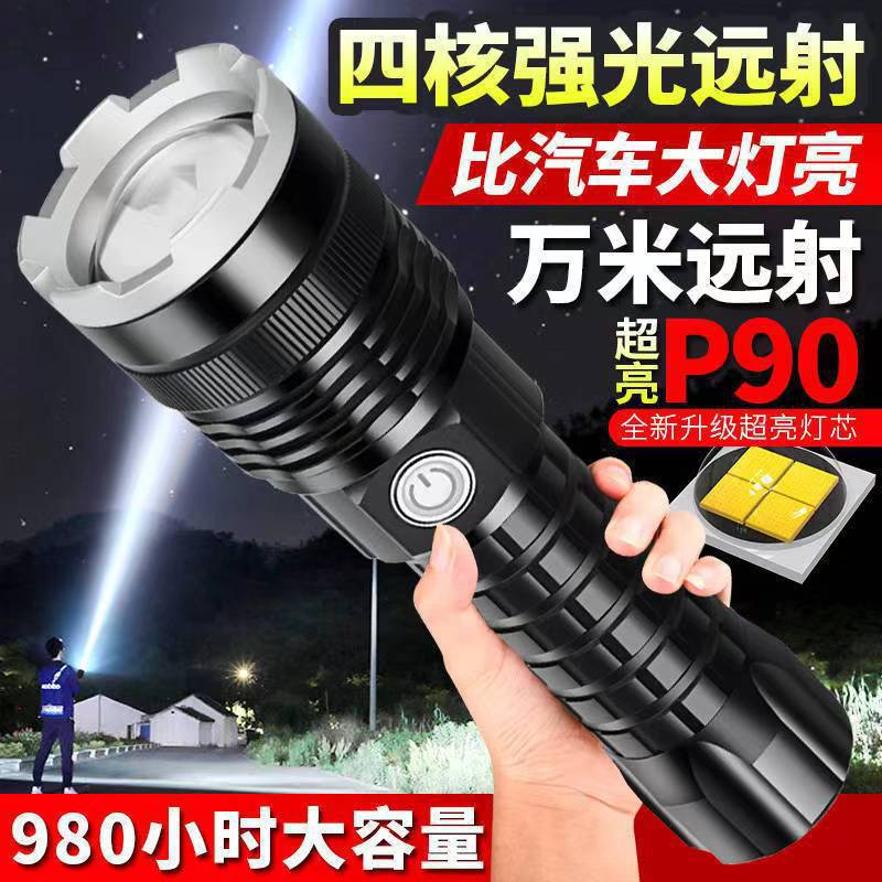 黑骑士P90手电筒强光充电户外超亮远射家用超长续航大容量USB车载