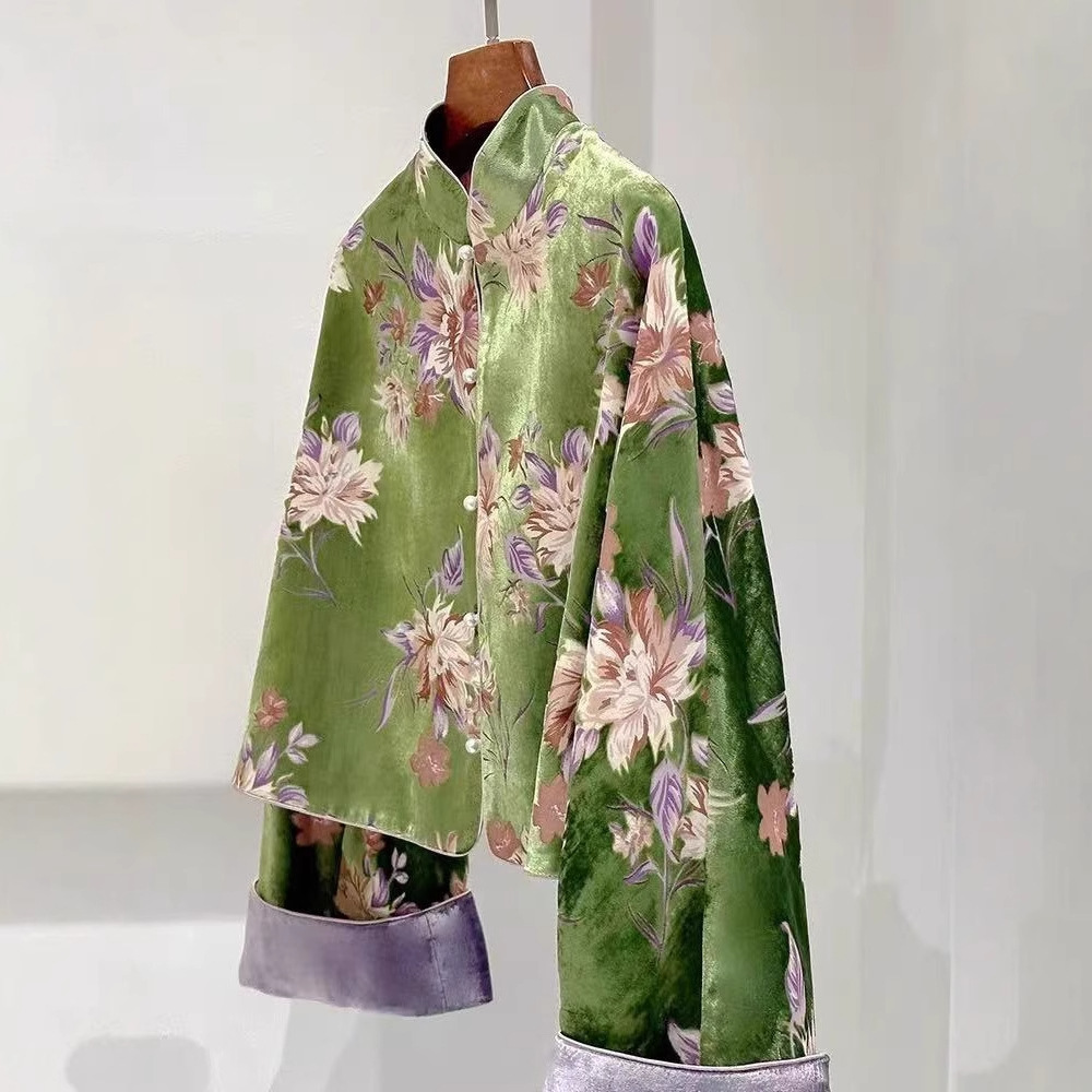 新中国式国風高級感小柄スタンドカラーグリーンベルベットバックル宋錦コート女性秋冬2025新作