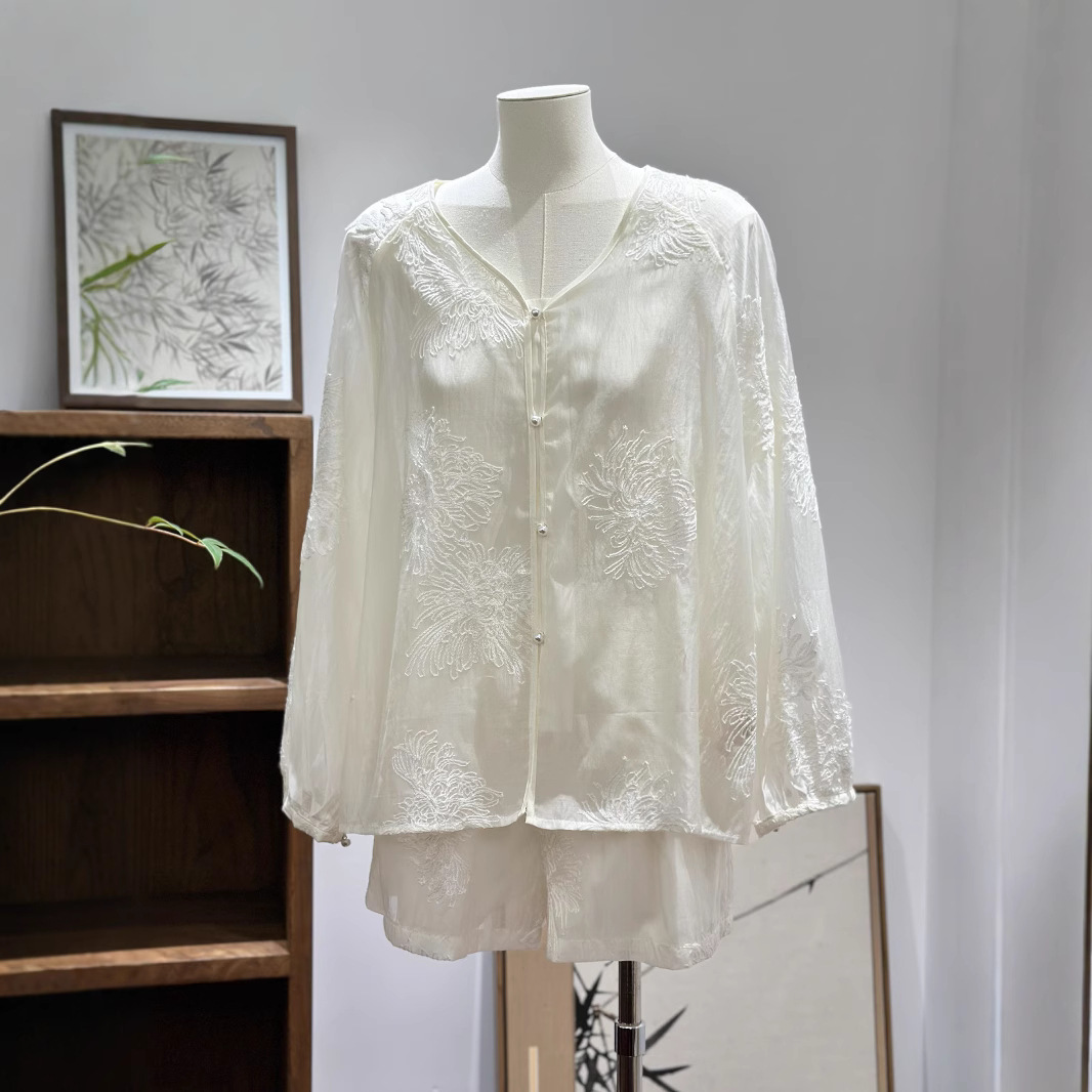 白い高級感珠光天糸長袖シャツ女性夏網糸薄い丸襟新中国式盤口刺繍カバー