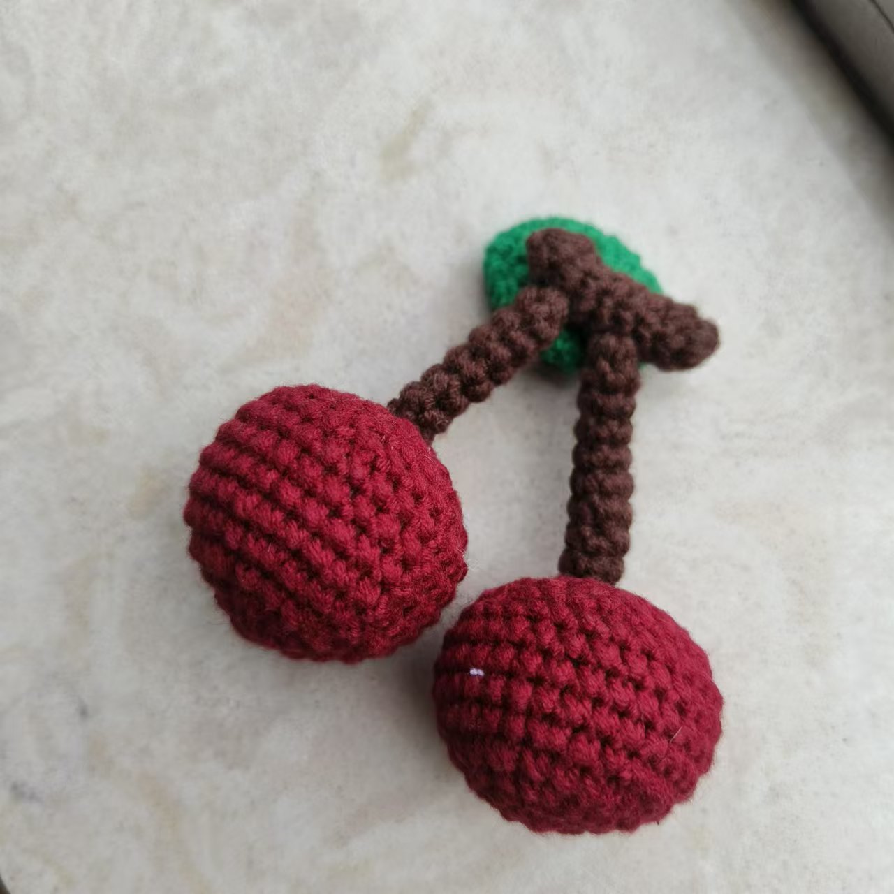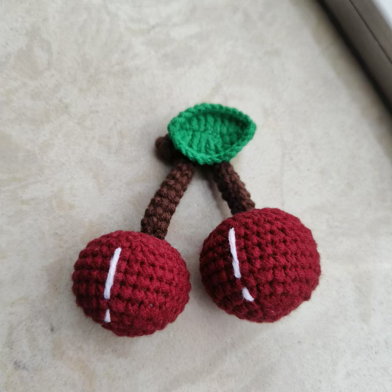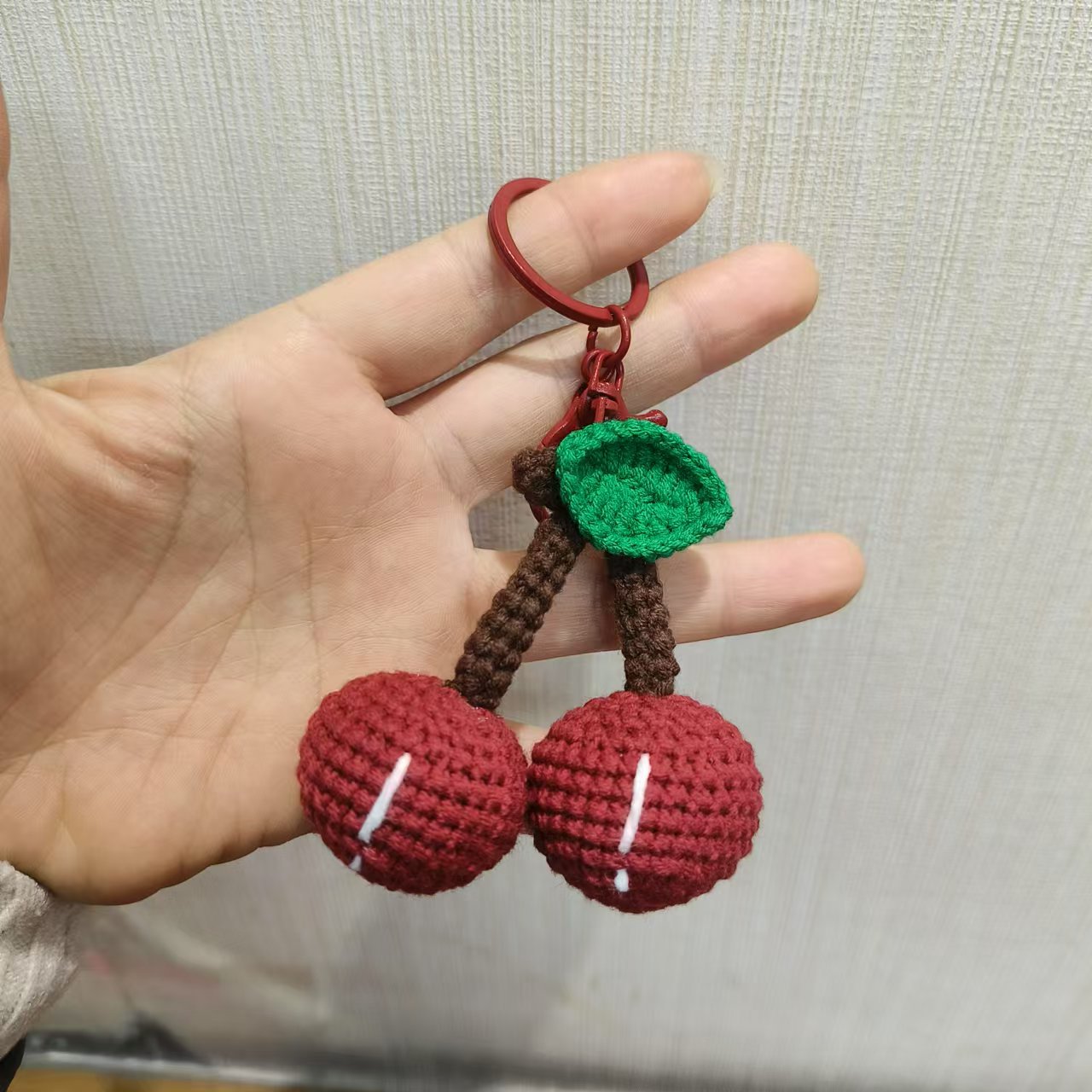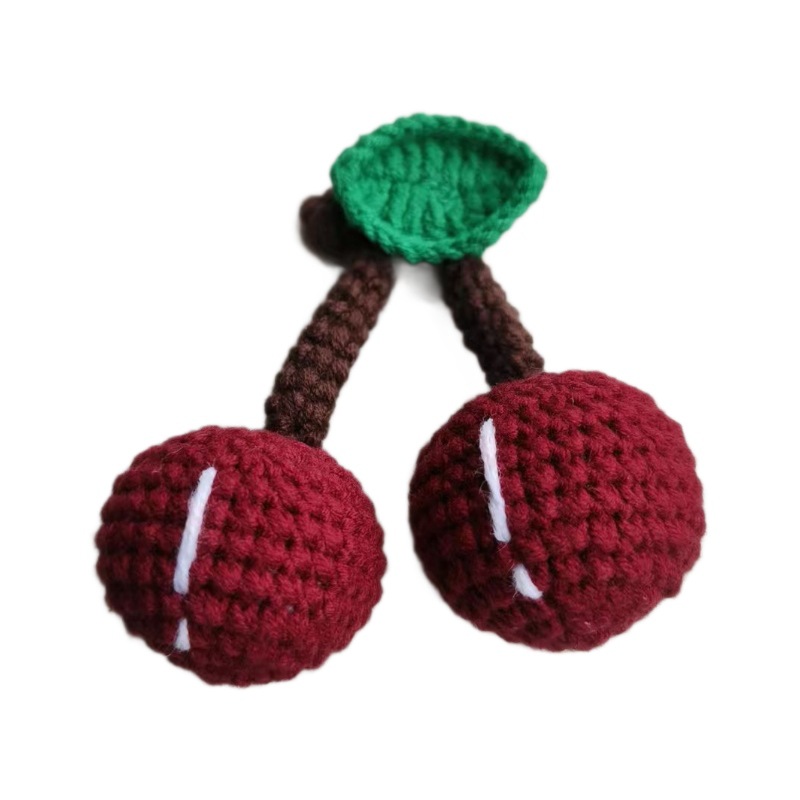 手作りの毛糸編みさくらんぼ車センチのキーホルダーにかわいい果物のストラップを掛けます。