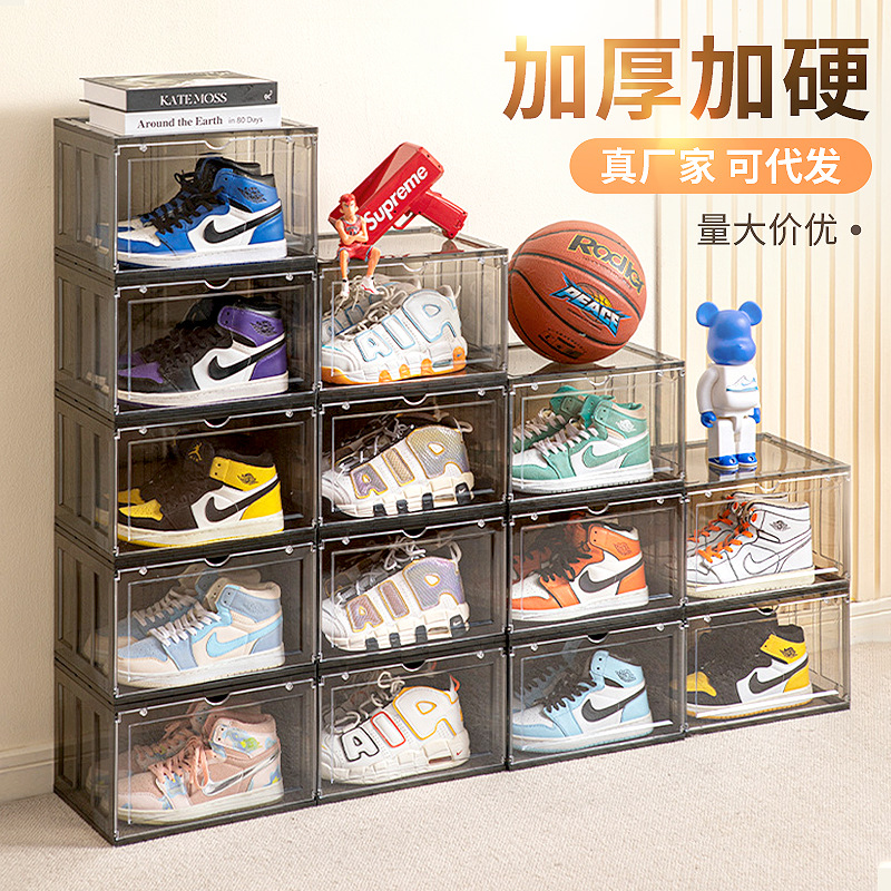 プラスチックの簡単なカバー式の組み合わせの下駄箱の靴棚の家庭用寮の厚い磁気吸引の収納箱の透明な靴の箱