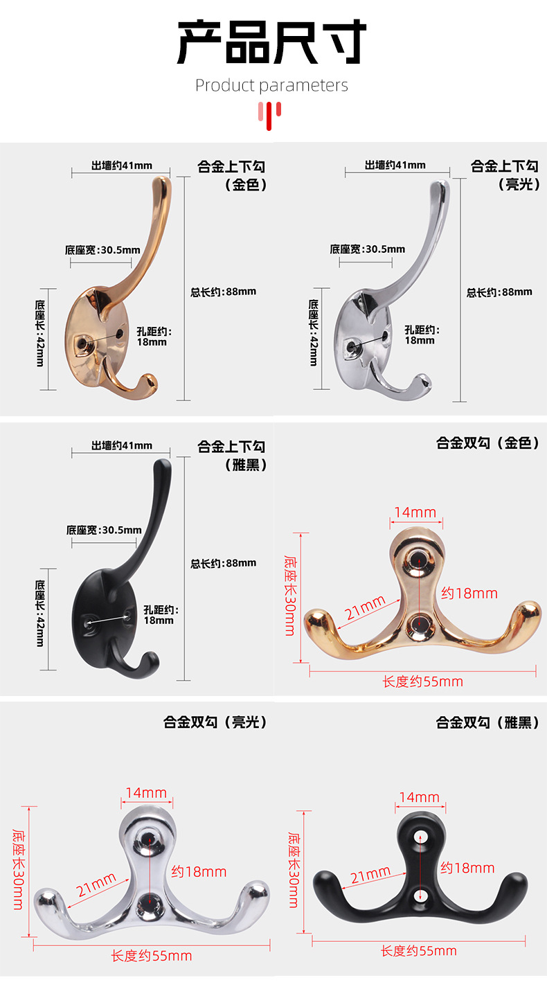 铝合金挂衣钩学生美式挂钩浴室厨房门后衣帽钩厕所挂钩墙上小双勾