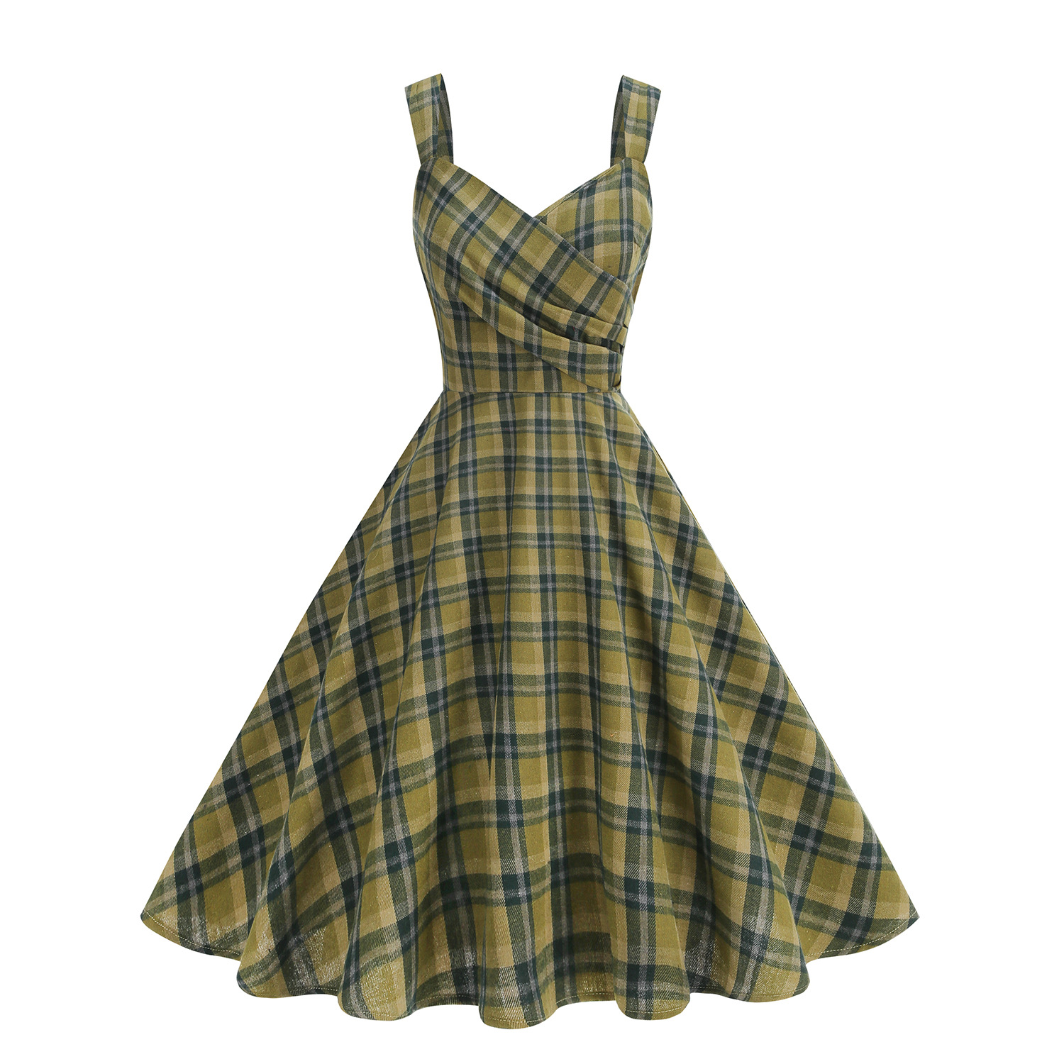 25秋赫本法式复古褶皱英伦格子V领艺术范大摆吊带跨境外贸连衣裙