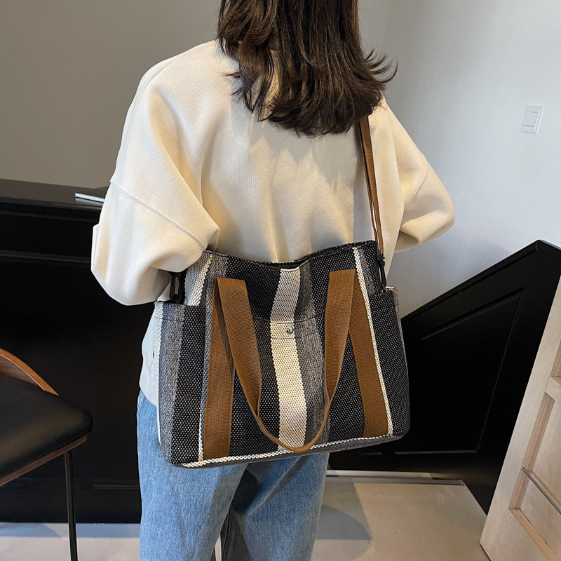 カジュアル大容量キャンバス2025新型個性縦縞カジュアルファッションシングル肩手提げバスケットバッグ女性