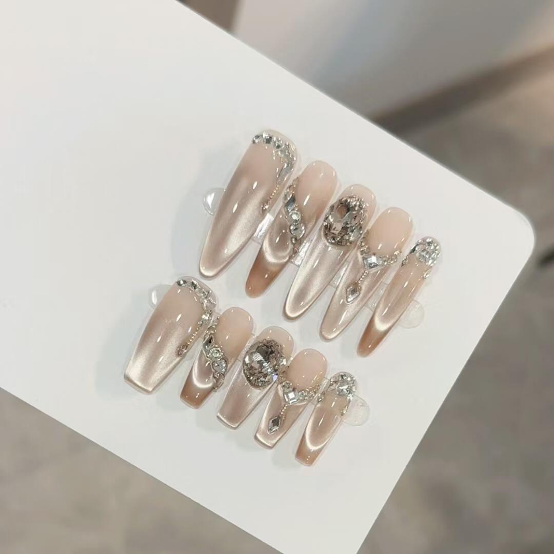 [Luo Yan] 純粋な手作りのウェアラブルネイル、ハイエンドのヌードブラッシュ、東州ダイヤモンド光療法、純粋な手作りのネイルアートステッカー、10枚