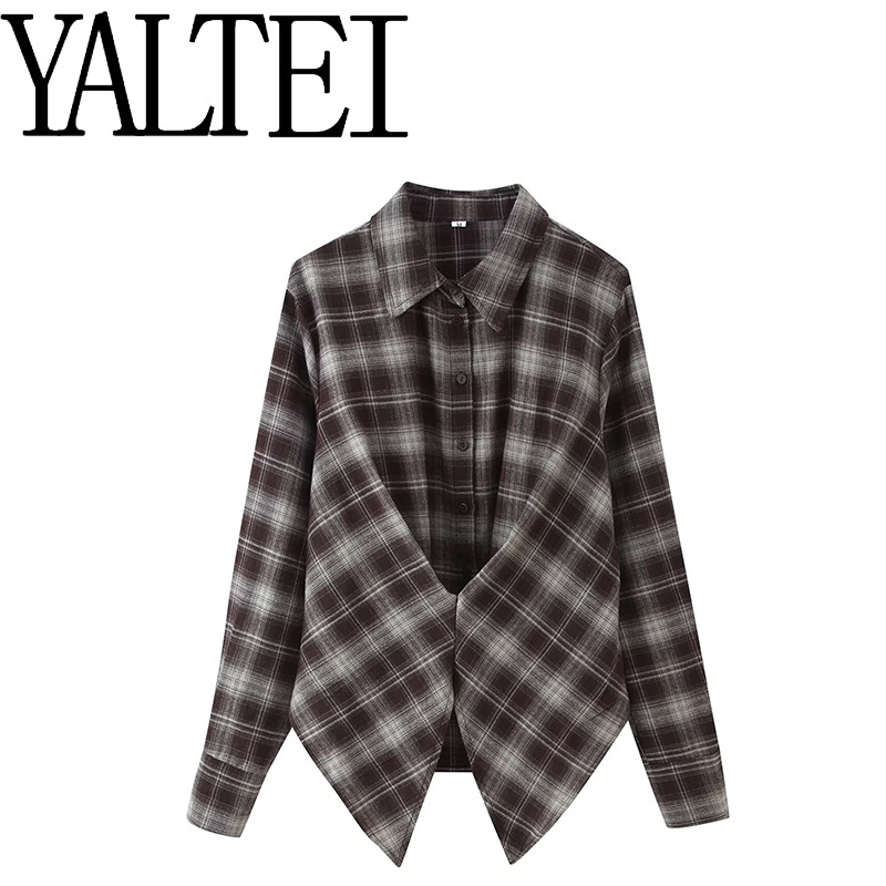 YALTEI跨境速卖通ins欧美外贸女装 百搭宽松翻领收腰长袖格子衬衫
