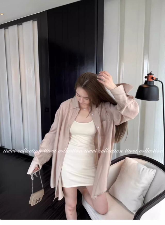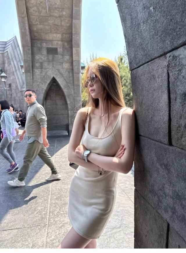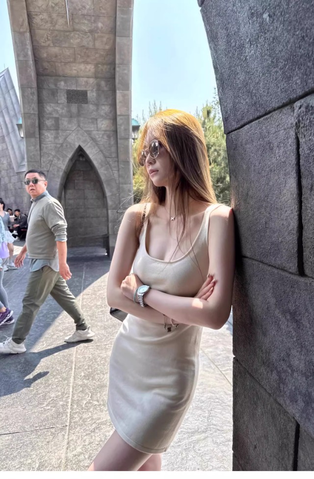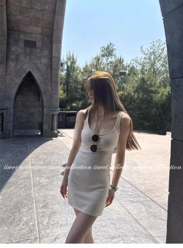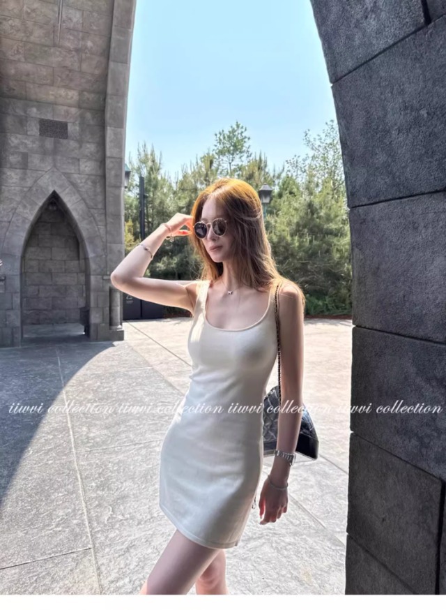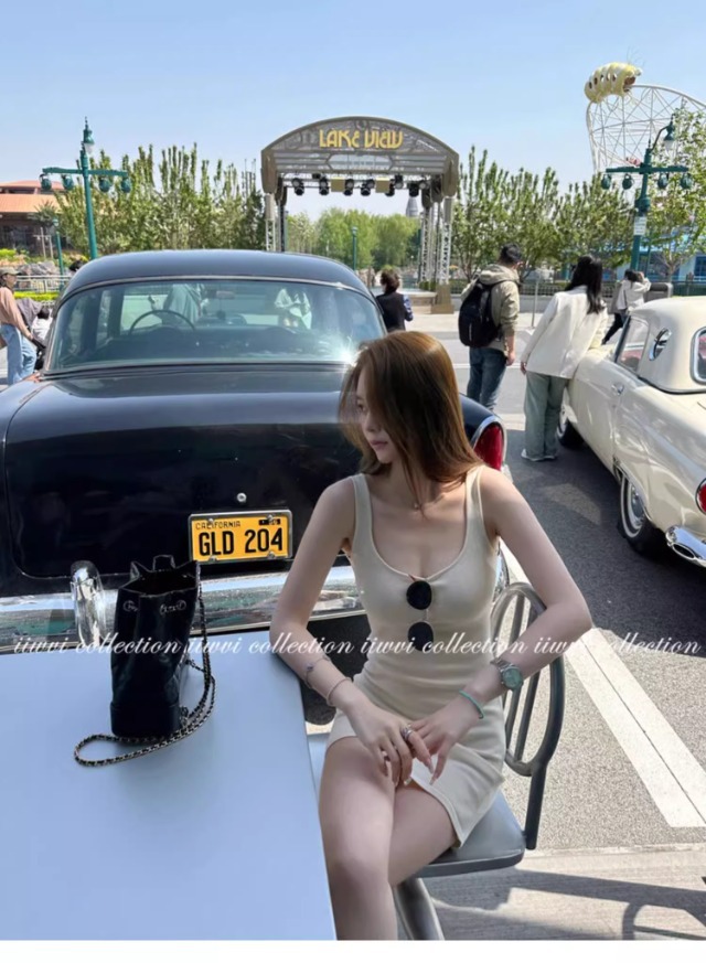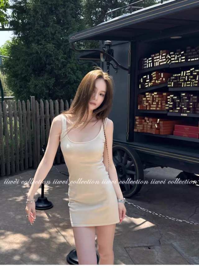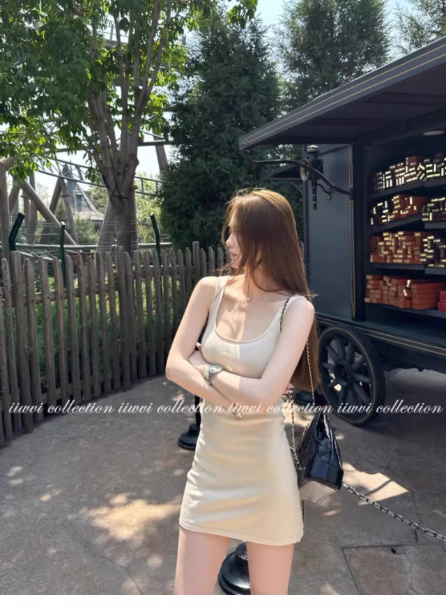 杏色のUネックのニットのサスペンダーのスカートのワンピースの女性の夏の新型の小さい人は腰を収めて身を修めて痩せています。