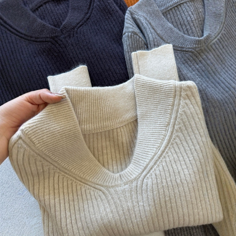 美式复古杏色v领长袖简约毛衣女秋冬高级感显瘦内搭打底针织上衣