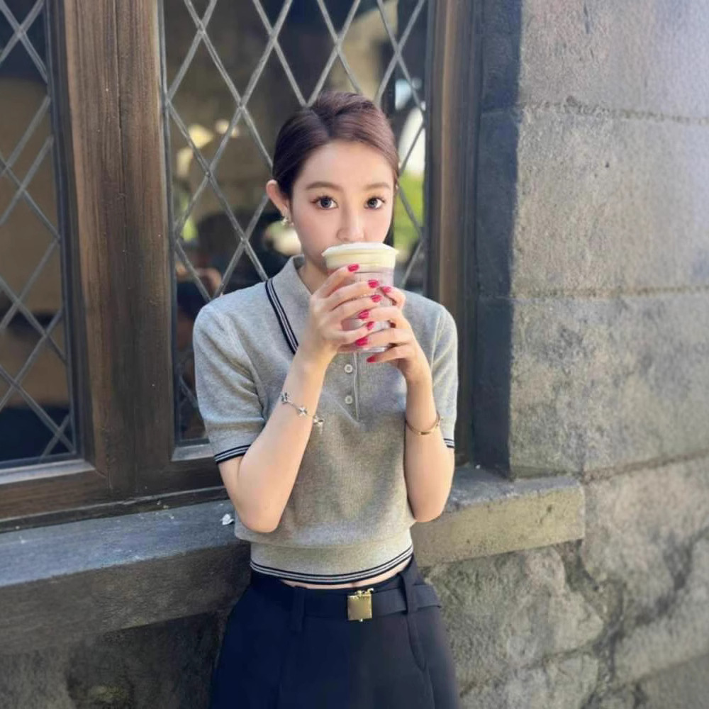 老銭風復古衝突色Polo襟半袖ニットtシャツ小衆洋気が腰を収めて痩せている正肩氷糸上着t