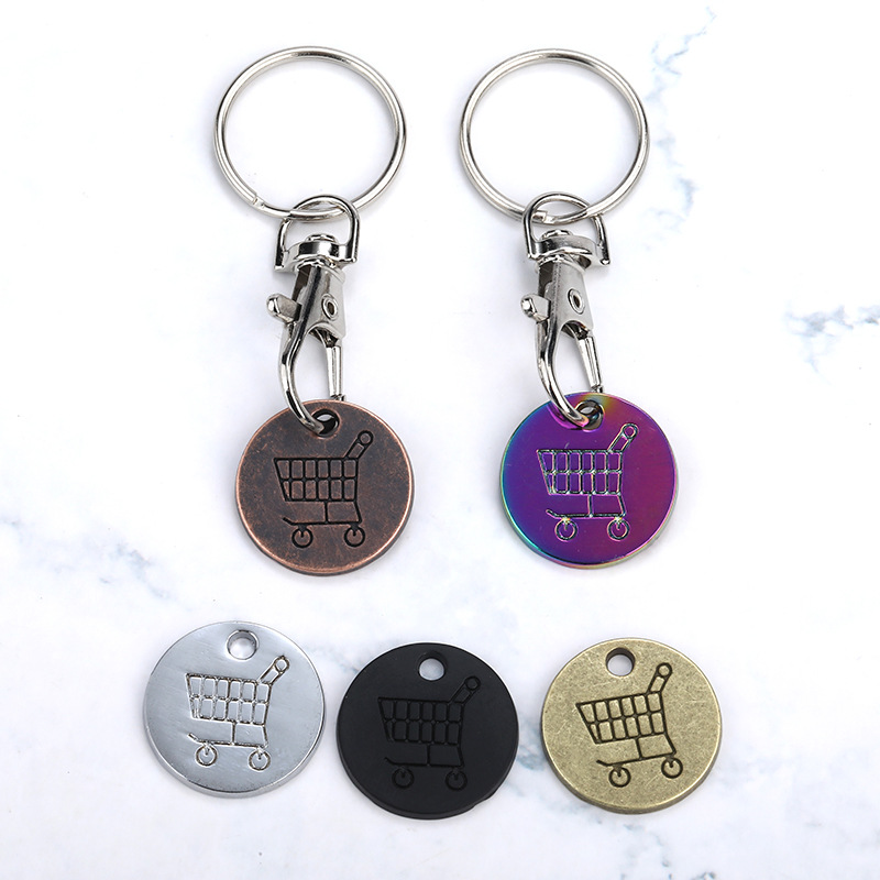 国境を越えた欧米のスーパーの手でショッピングカートのロゴのコインの金属のトークンのロブスターボタンのキーホルダーの広告の贈り物を押します。
