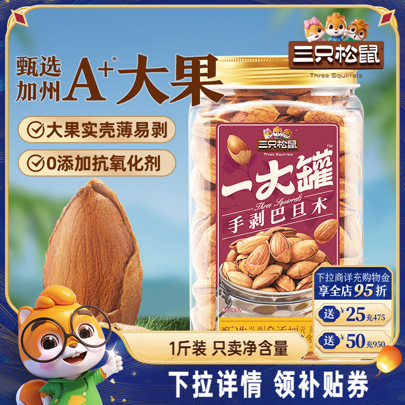 【三只松鼠量贩巴旦木500g】NP扁桃仁罐装大颗粒坚果零食健康早餐