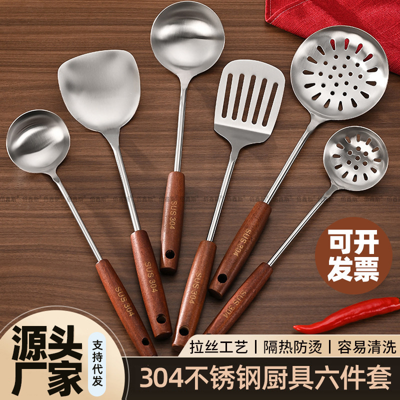 加工済み304ステンレス製鍋用スパチュラセット、キッチン用品、家庭用木製ハンドル付きスープスプーン、フライパン用スパチュラ、長柄の調理用スパチュラ