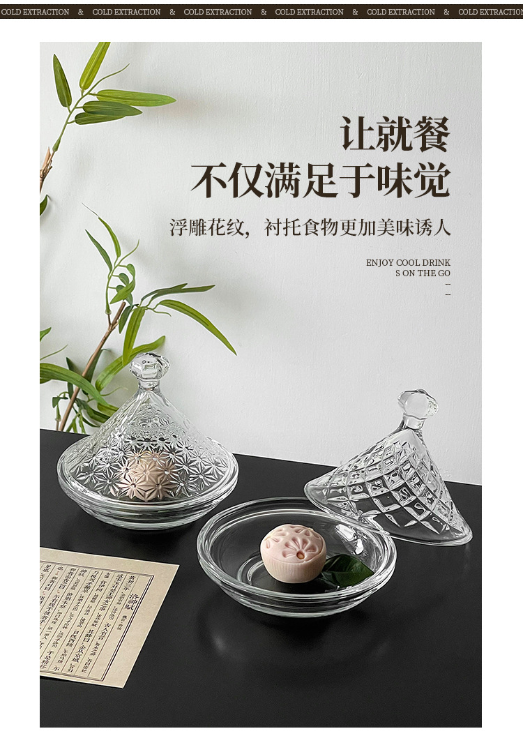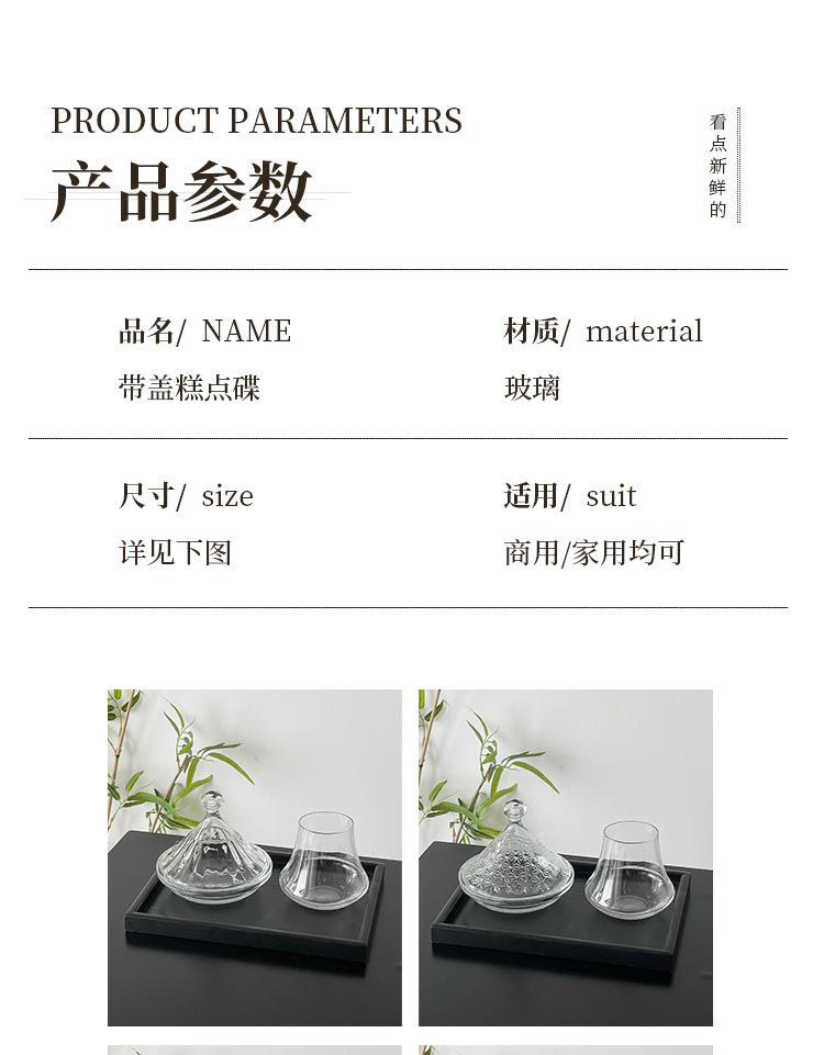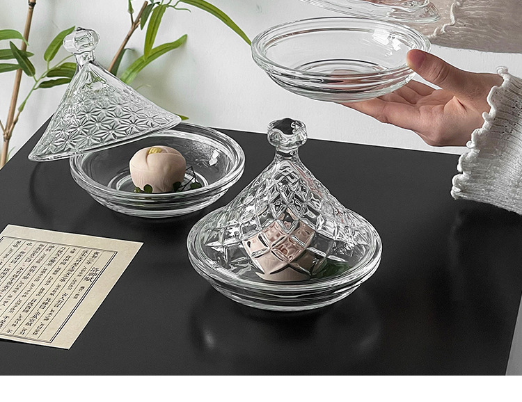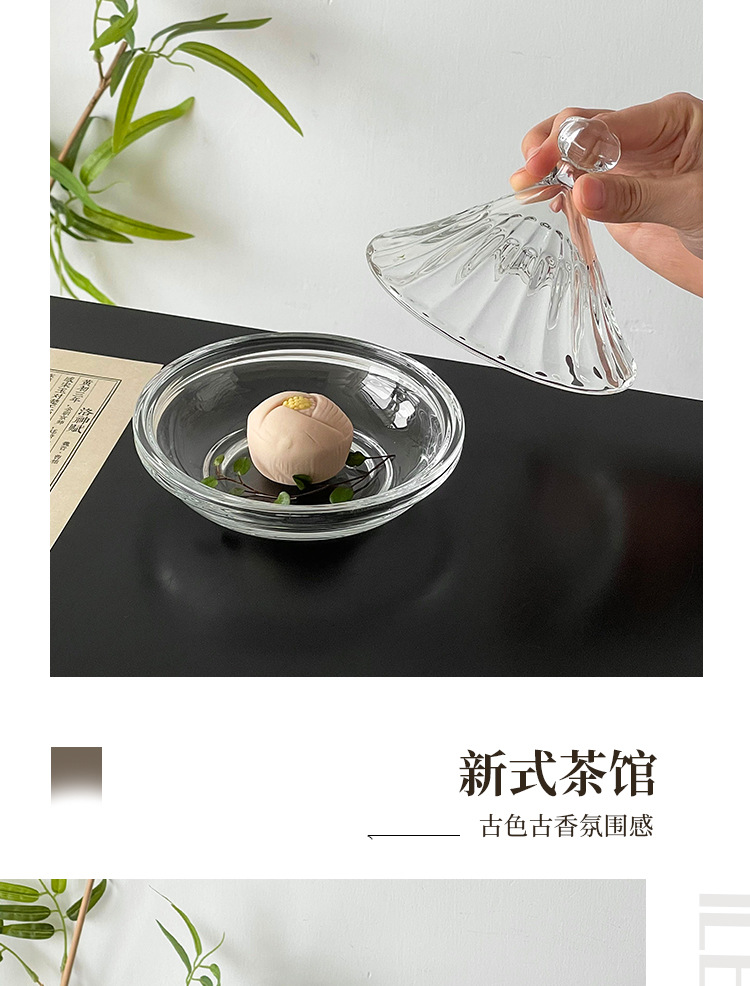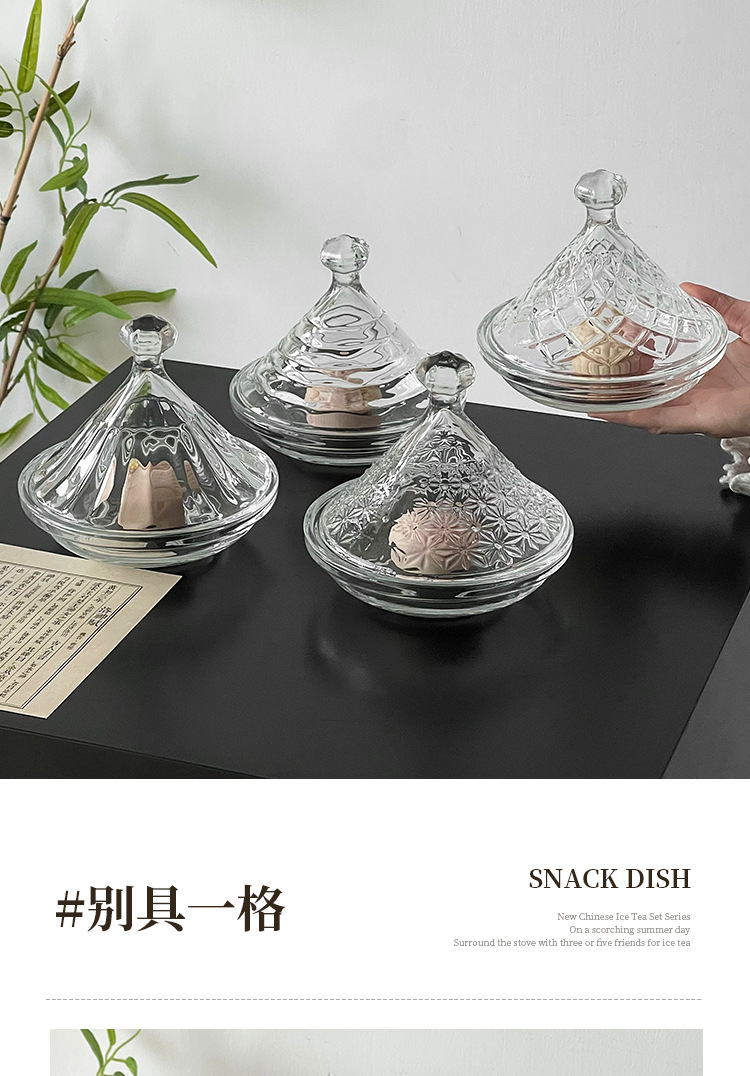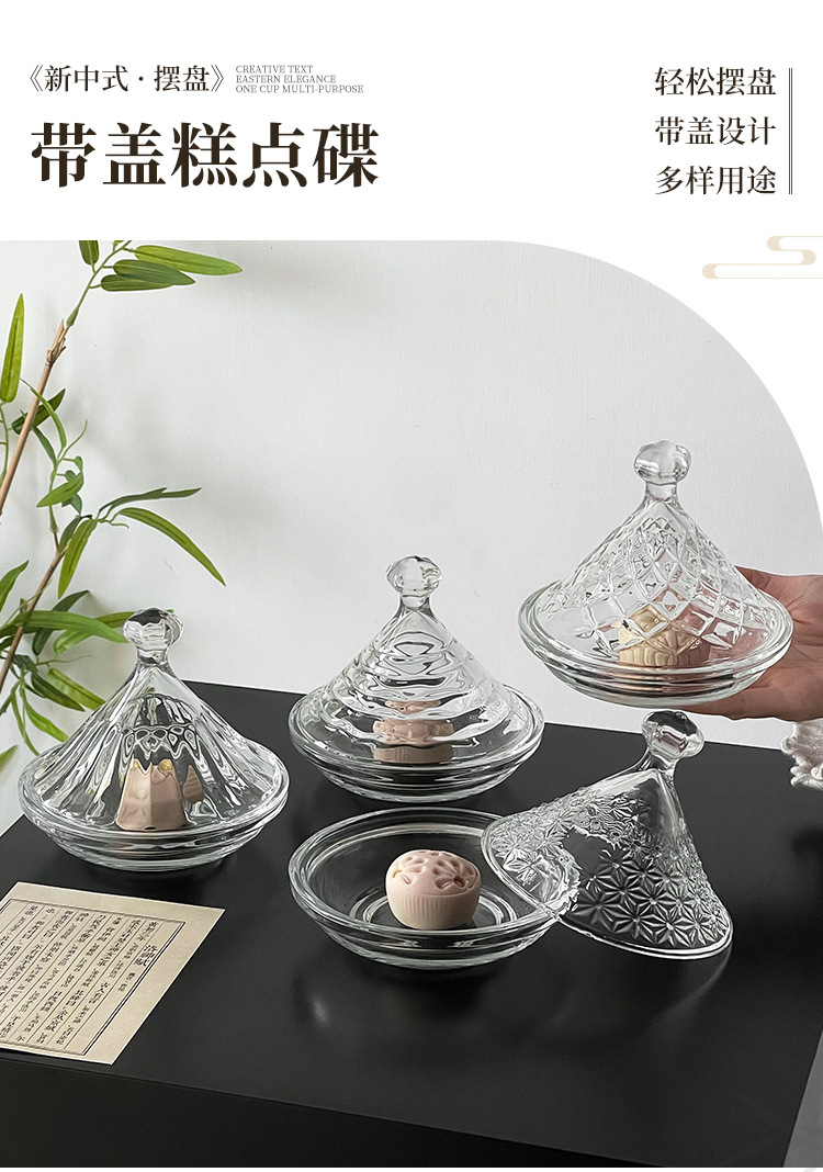 中国式創意蓋付き茶点皿透明ガラス円錐デザート杯午後茶軽食果物菓子ガラス杯