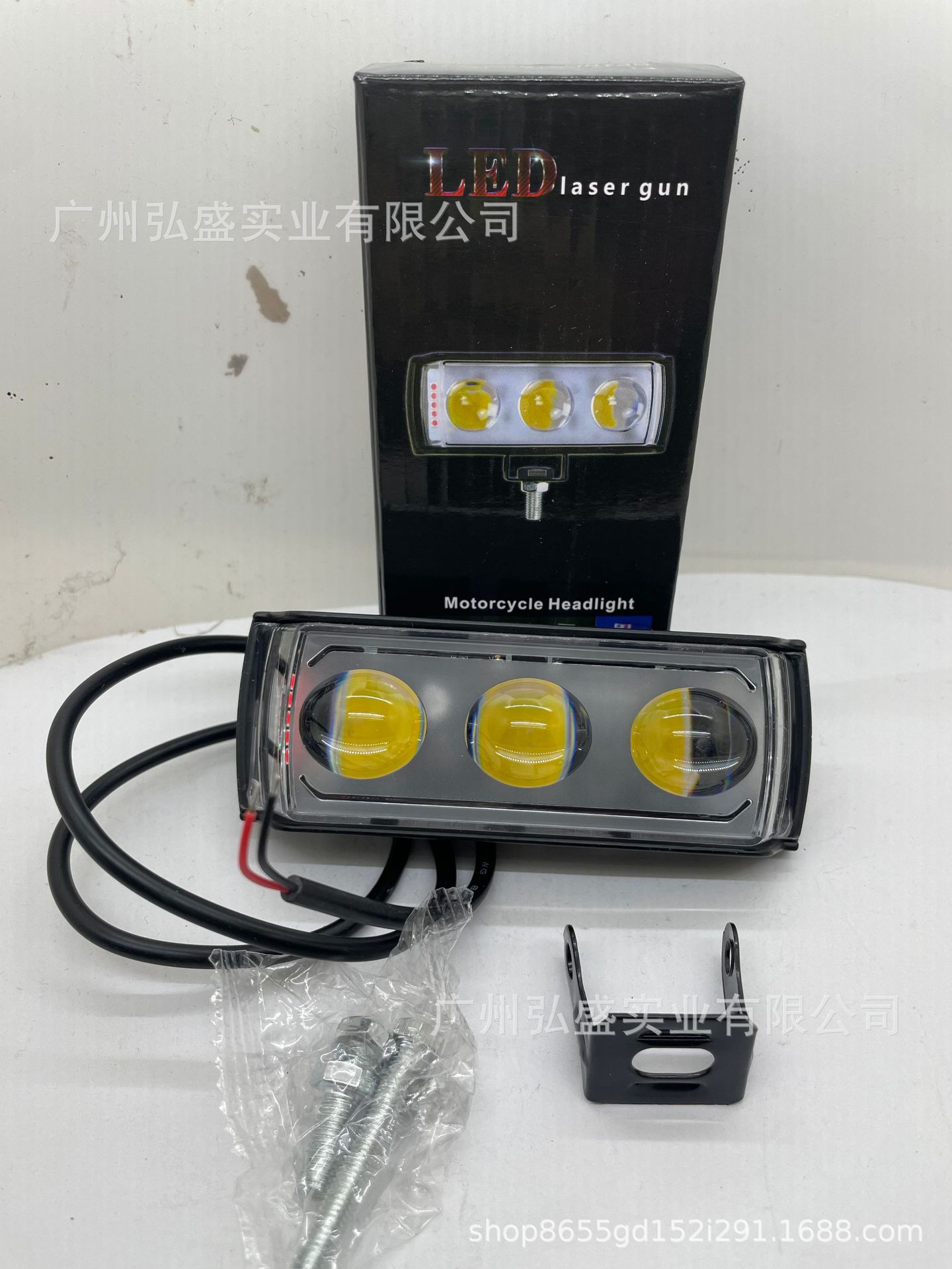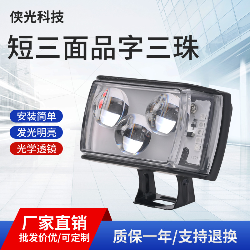 跨镜摩托车前照灯短三面品字三珠高亮LED电动车灯外置摩托车射灯