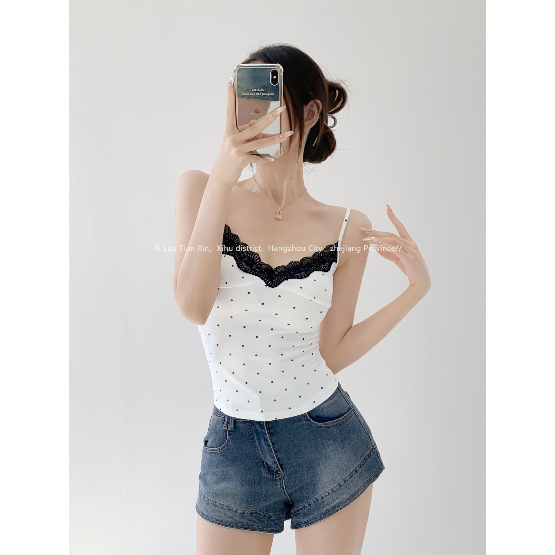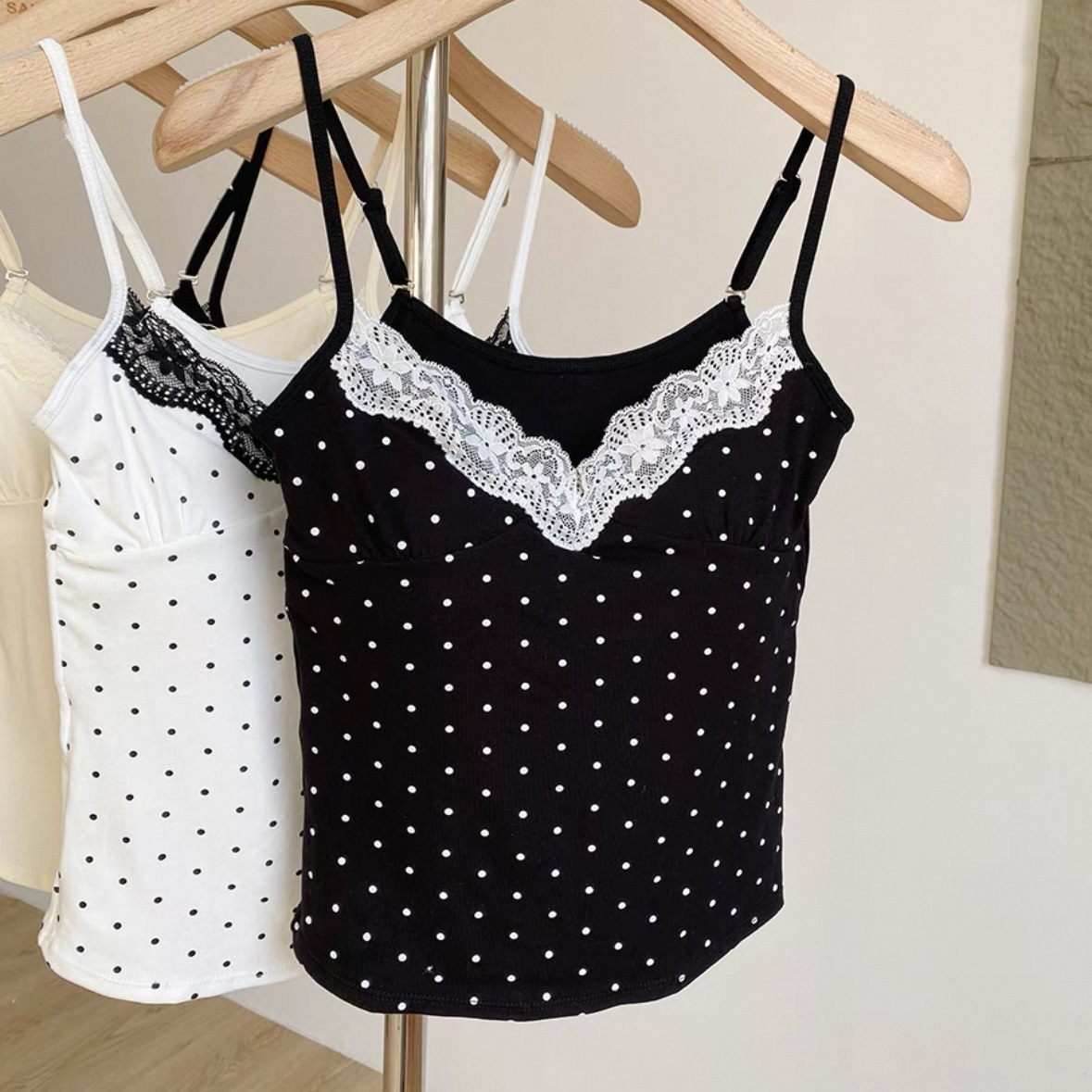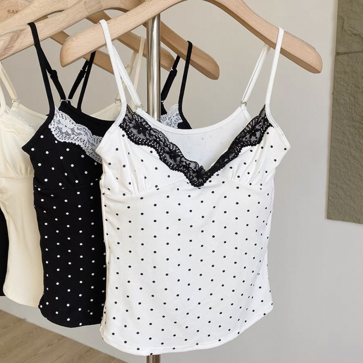 大きいvネックのレースのつなぎ合わせの波の点のストラップのベストの女性の夏の外はセクシーなギャルの中で組み合わせて見せます。