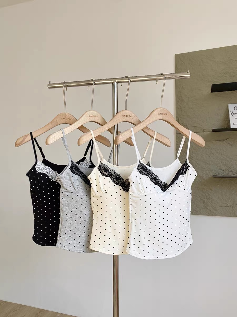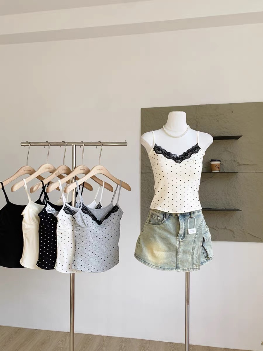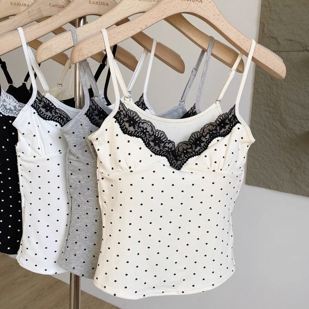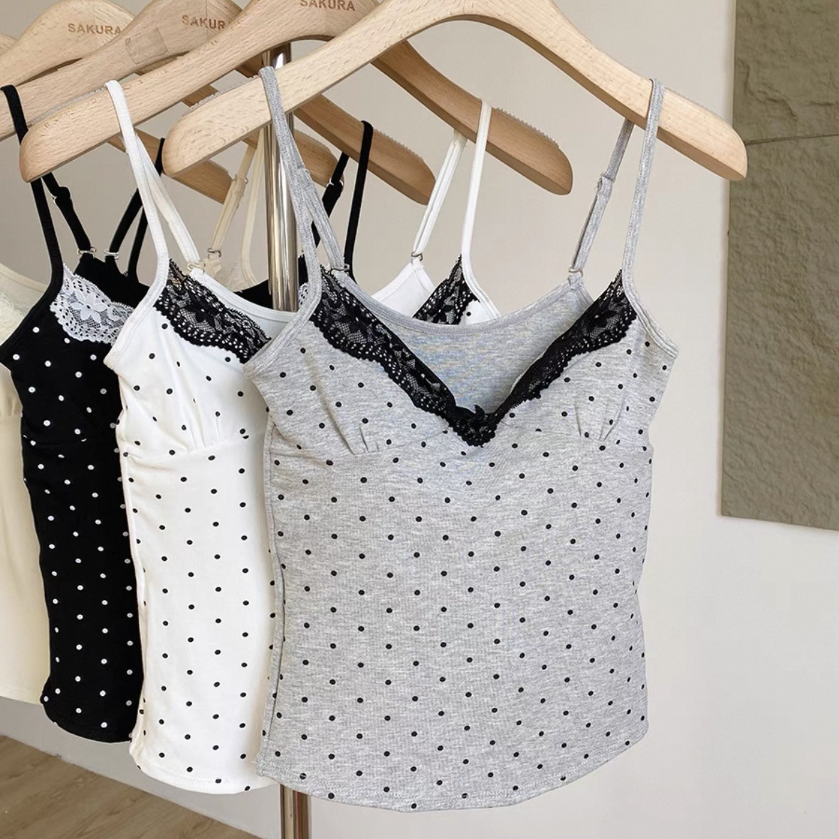 大きいvネックのレースのつなぎ合わせの波の点のストラップのベストの女性の夏の外はセクシーなギャルの中で組み合わせて見せます。