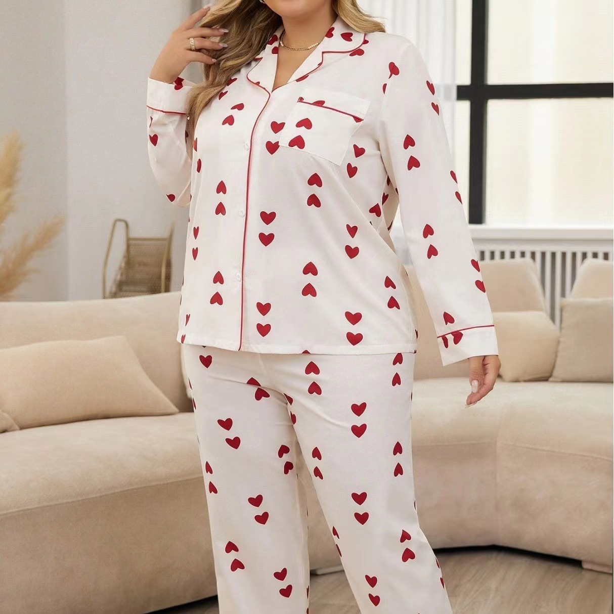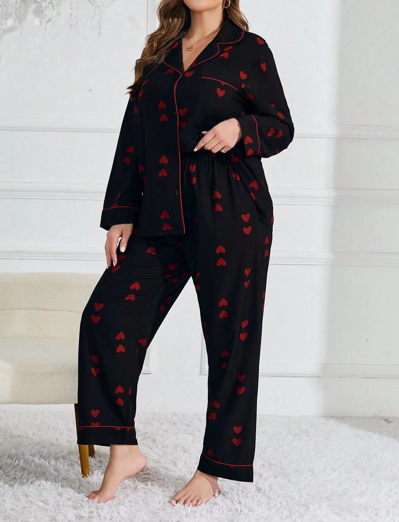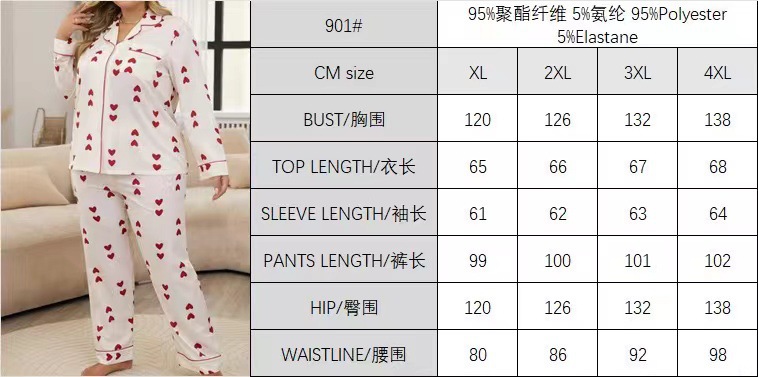欧米のクロスボーダーの女性のカーディガンの長袖のズボンの甘い小さい愛の家庭服の大きいサイズのパジャマは太って2セットを増加します。