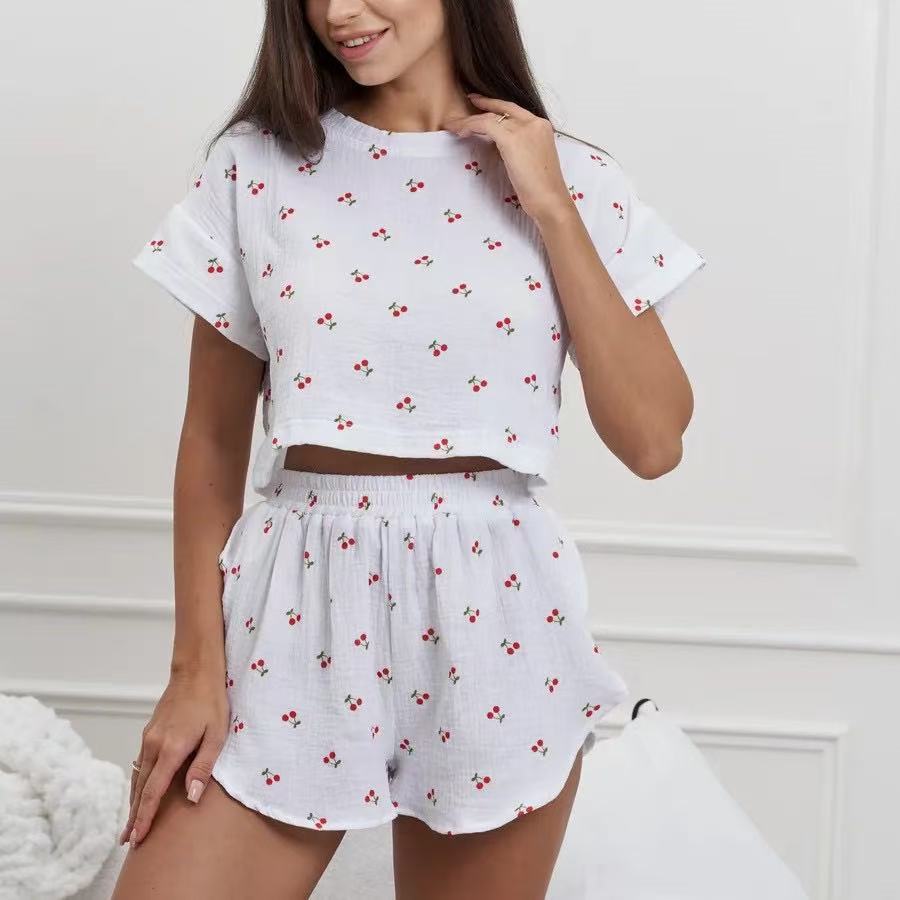 2025 ヨーロッパとアメリカの国境を越えた新しい綿ガーゼ純綿プリントルーズで柔らかい半袖ショーツ女性用チェリー