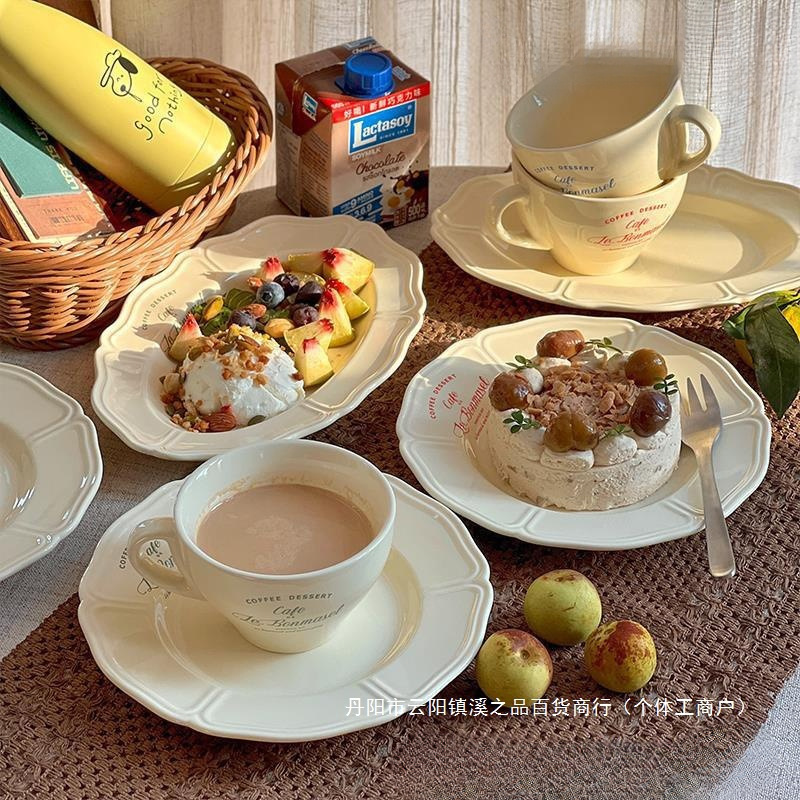 韓国のインスタで話題のレトロなフレンチクリーム色のデザートプレート、丸皿、花柄プレート、セラミック楕円形プレート、コーヒーカップ