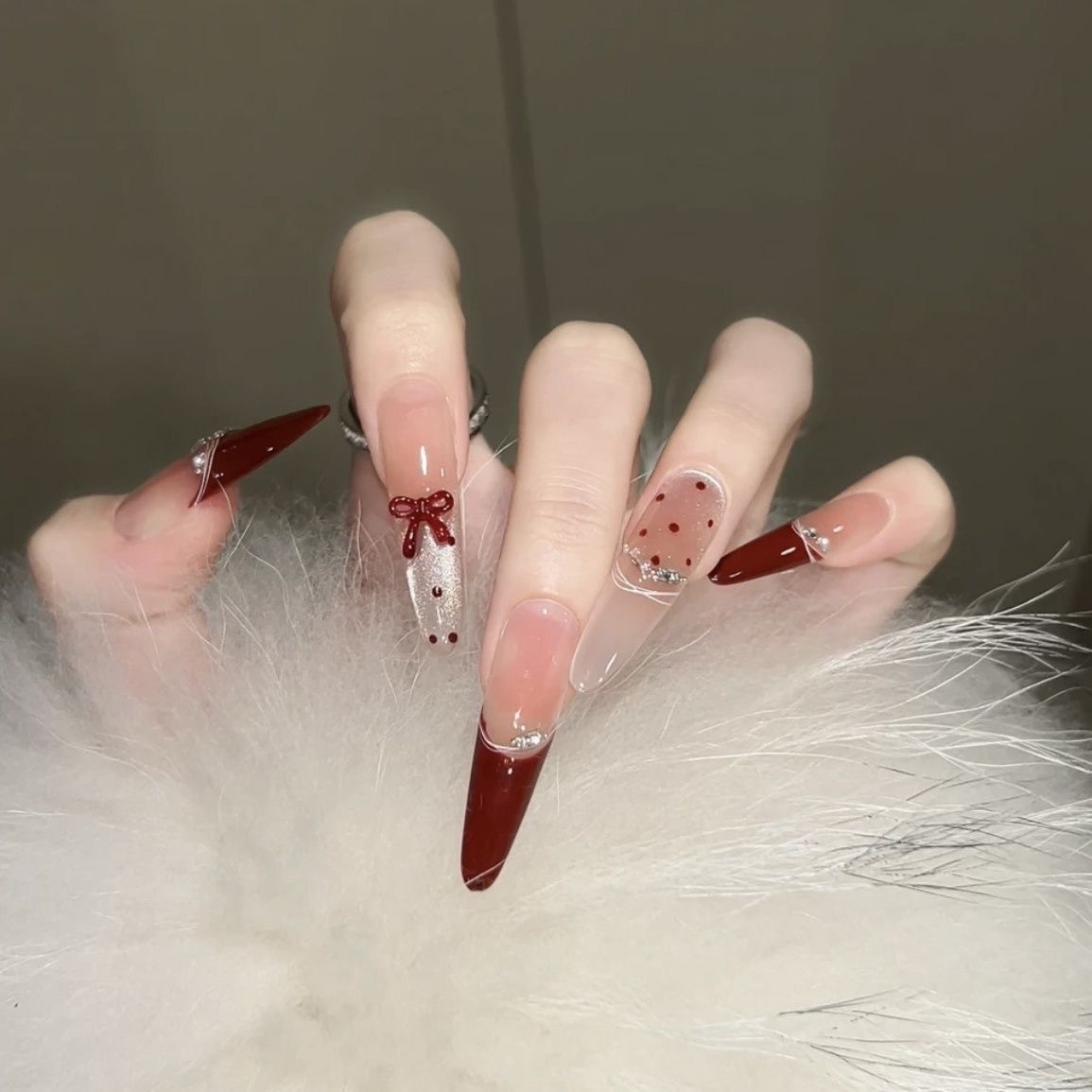 安可拉红新年猫眼法式红色美甲气质波点高级显白爆闪纯手工穿戴