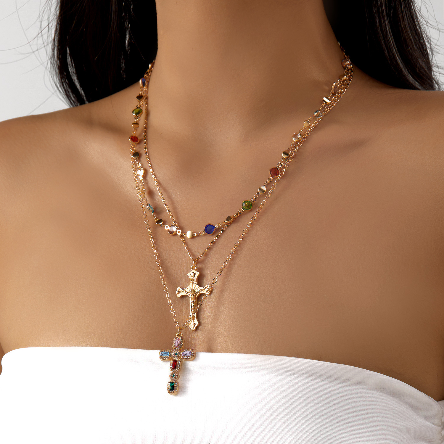 厂家直销跨境十字架项链套装时尚百搭金属链条多层叠戴毛衣链批发