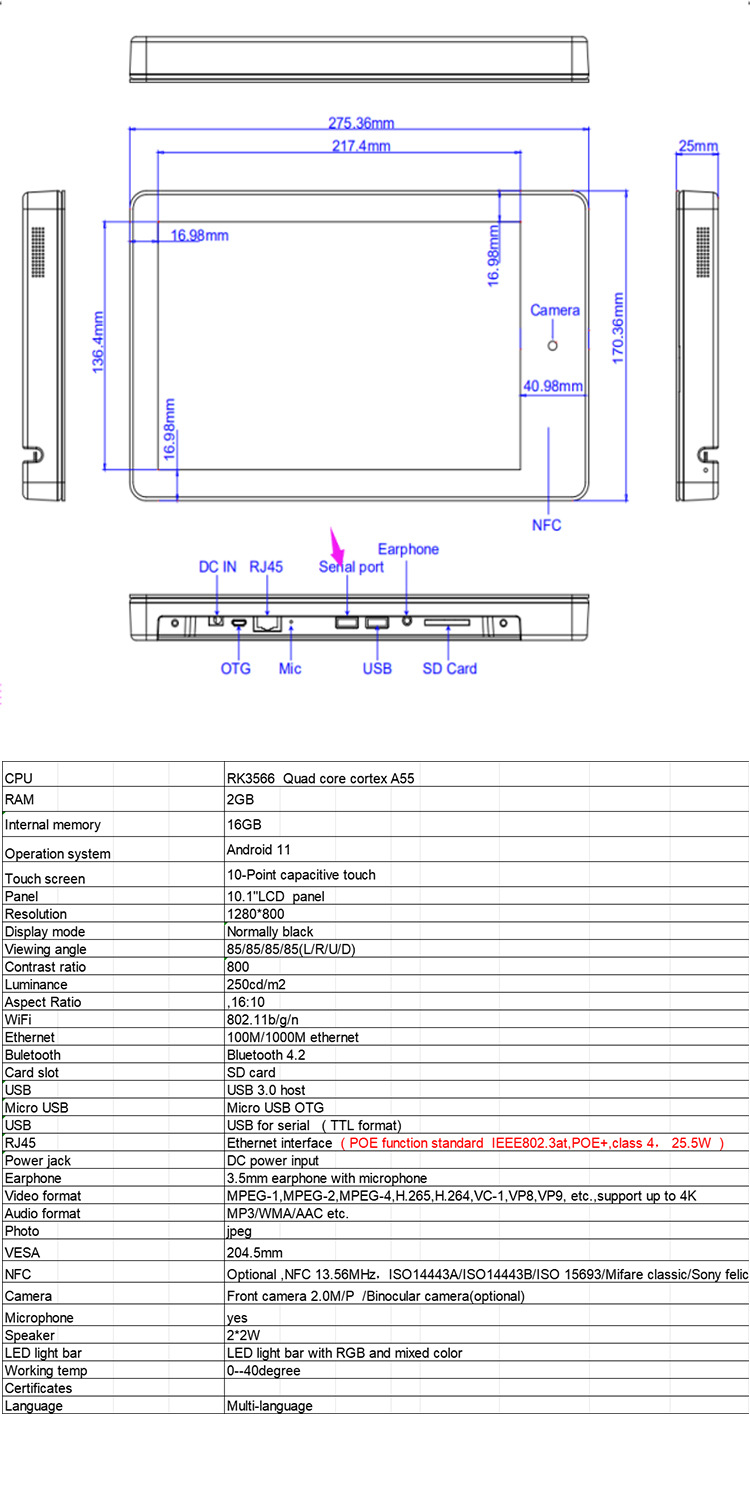 仕様 10.1inchRK3288 (2+16GB) 5G Wifi、2.0million 広角カメラ + 全面照明、POE 付き,10.1inchRK3566 (2+16G) 4 面照明、POE、5G Wi-Fi、2.0million 広角カメラ付き,10.1inchRK3568 (2+16G) 4 面照明、POE、5G Wi-Fi、2.0million 広角カメラ付き,10.1inchRK3399 (2+16GB) 5G Wifi、2.0million 広角カメラ、四方照明、POE 付き,10.1inchRK3576 (4+32GB) Wifi6、2.0million 広角カメラ、四方照明、POE Android 14,NFCを追加