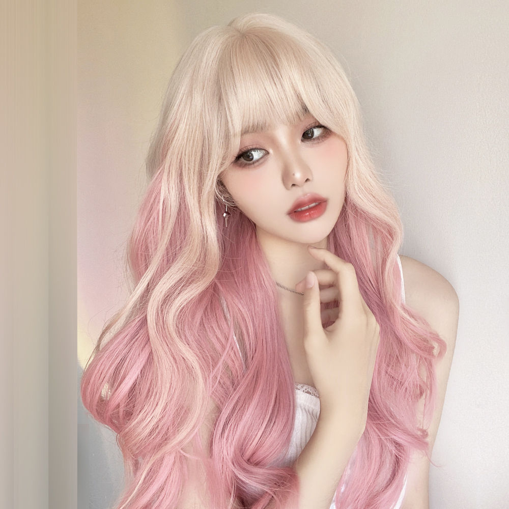 ウィッグ 女性用 プラチナグラデーション 桜ピンク ロングカールヘア ロリータ風 カラフルな大きなウェーブ フルウィッグ ロングタイプ 前髪あり
