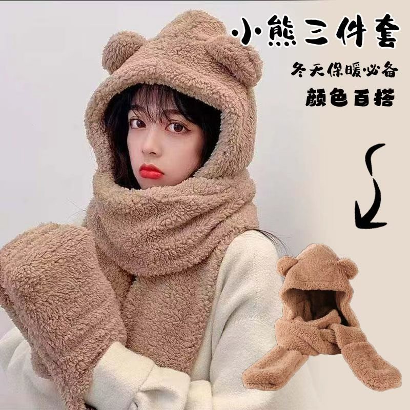 小熊保暖帽子连帽围巾手套一体护颈毛绒防寒防风帽三件套秋冬女
