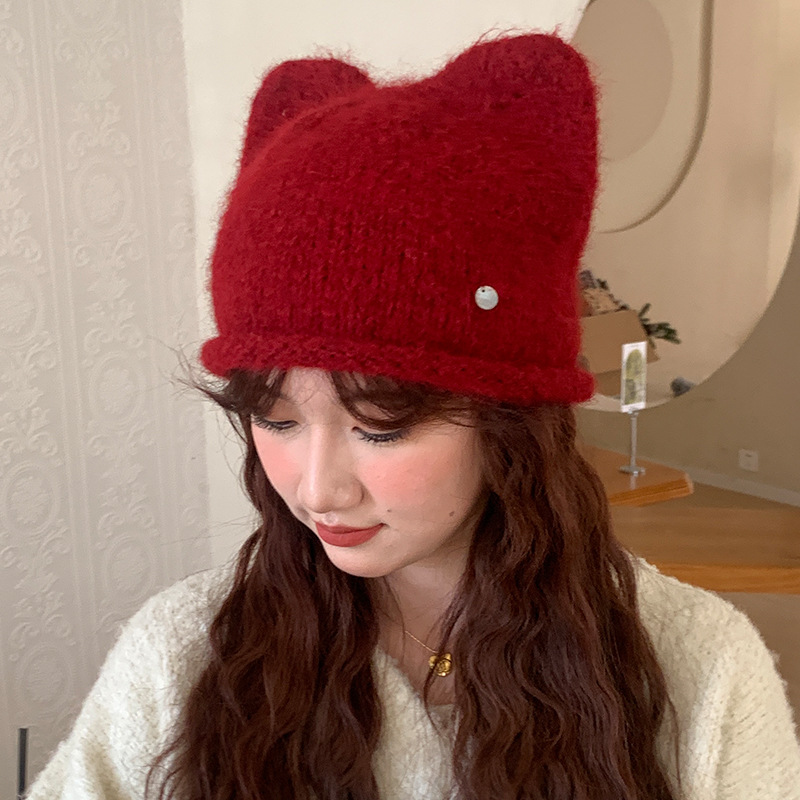 秋冬はかわいい猫の耳のニット帽を合わせます。