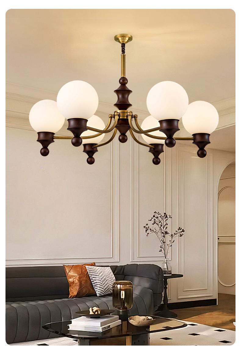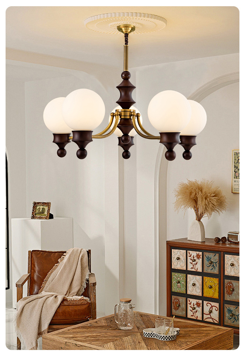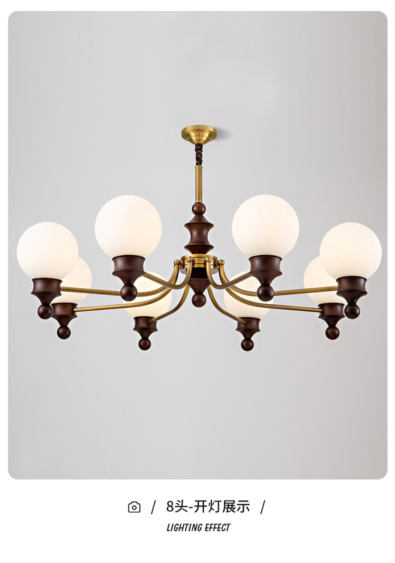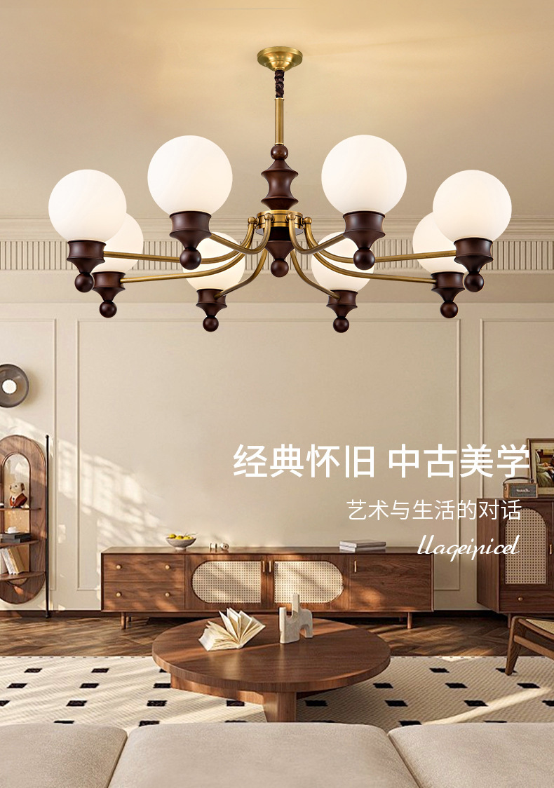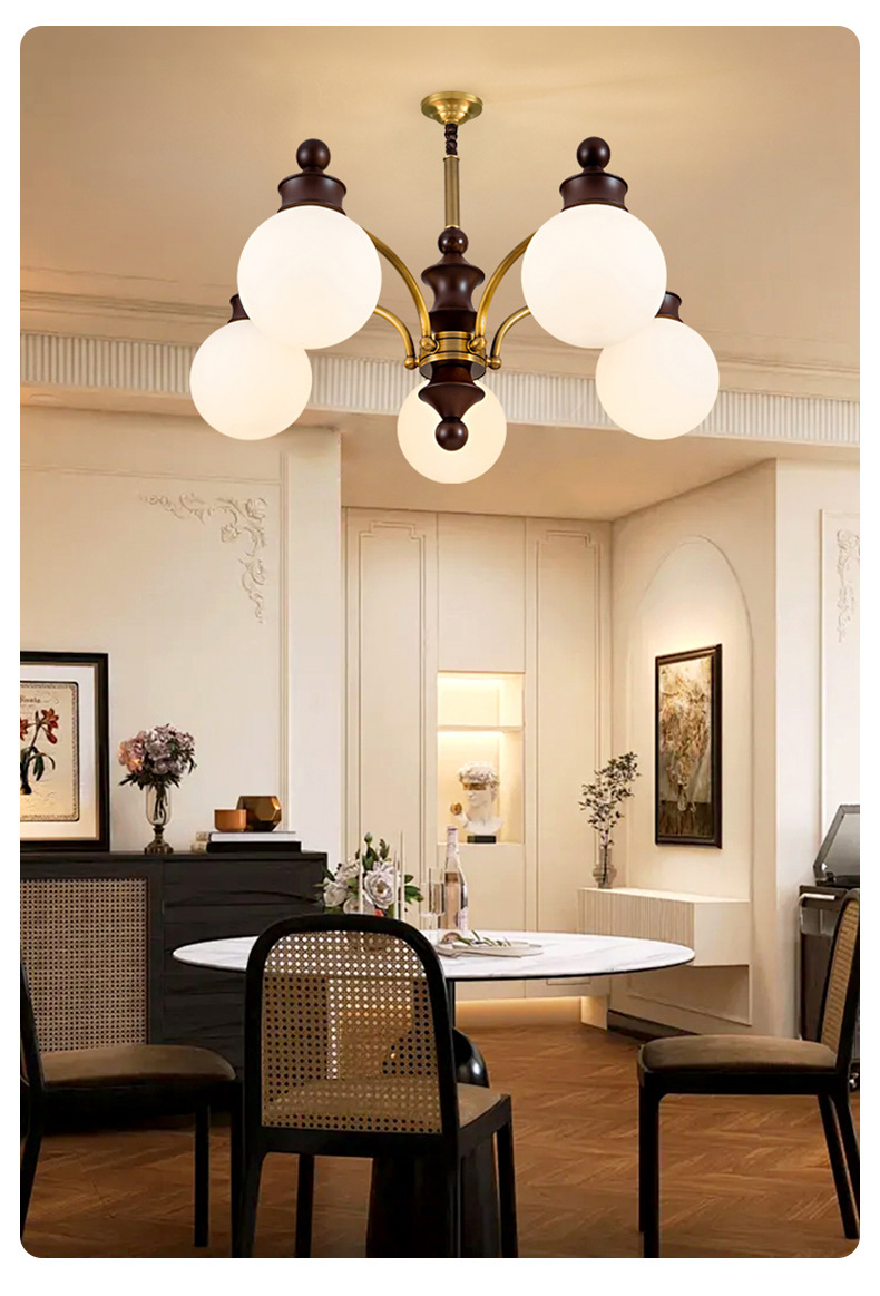 中世スタイルのレストランシャンデリアクルミ色のわびさびスタイルのハイエンドレトロダイニングテーブルティールームワンワードランプ中山ランプ