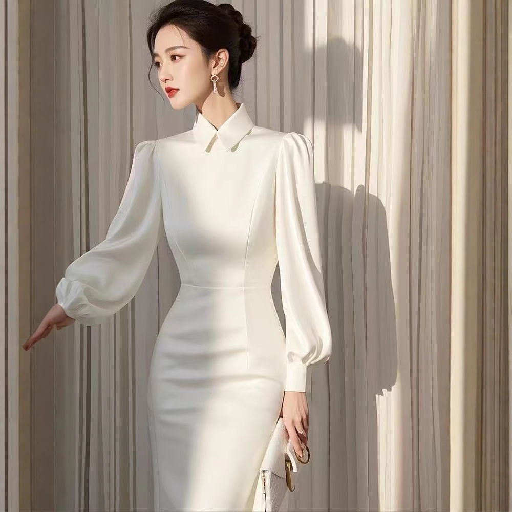 春秋の高級宴会のドレスの女神の範の長いスカートの高級感の端正な大気の超美しい白いワンピースの女性