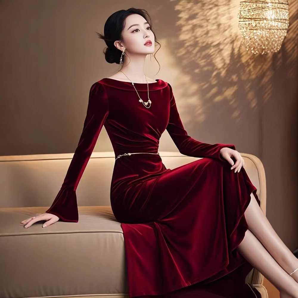 秋の上で新しいハイエンドのワインの赤い服は気質の女神の範の高級感のお姉さんの軽い熟している風の金のベルベットのワンピースの新型を着ます。