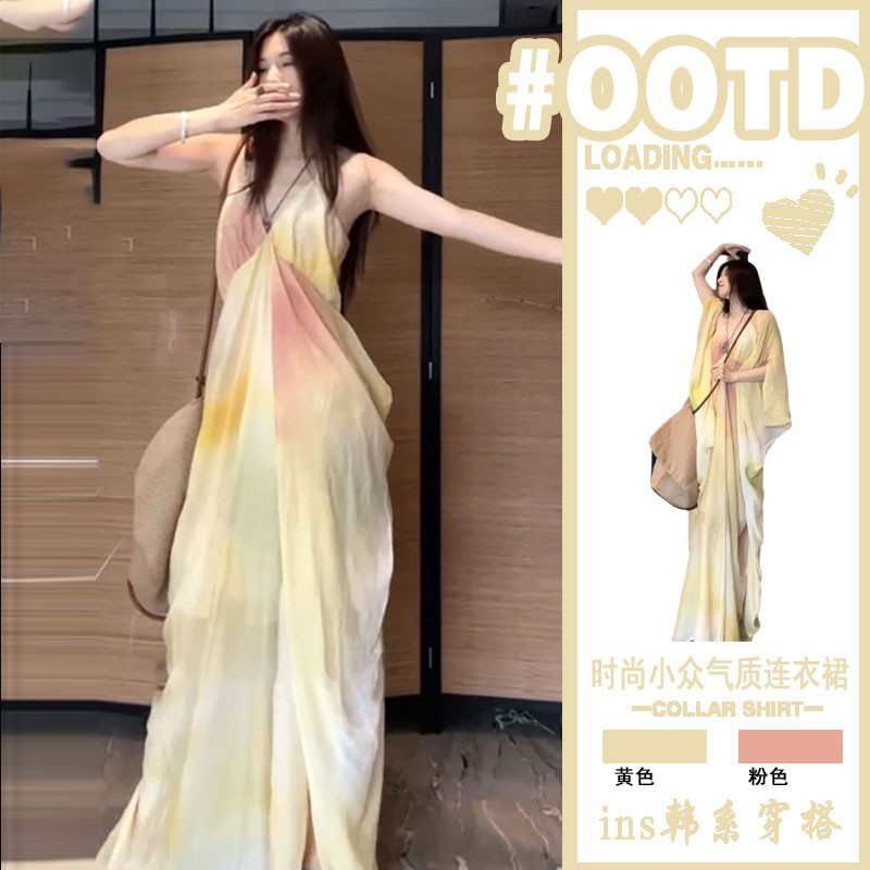 フランス式アンドロメダ気質海辺休暇ロングスカートペンダント感黄色ぼかしプリントvネック夏ストラップワンピース