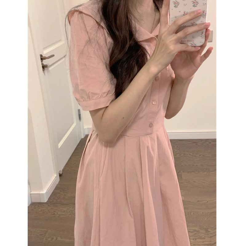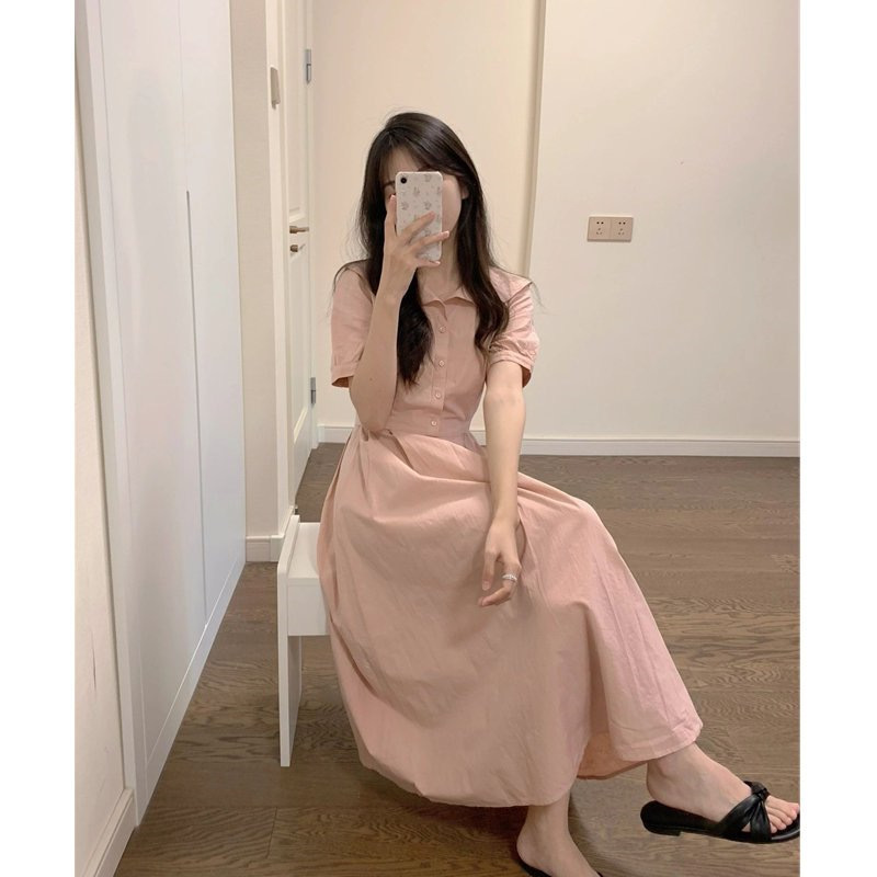 韓国ポロカラーストラップ半袖ドレス女性の夏ニッチウエストユニークな美しいブルーaラインロングスカート