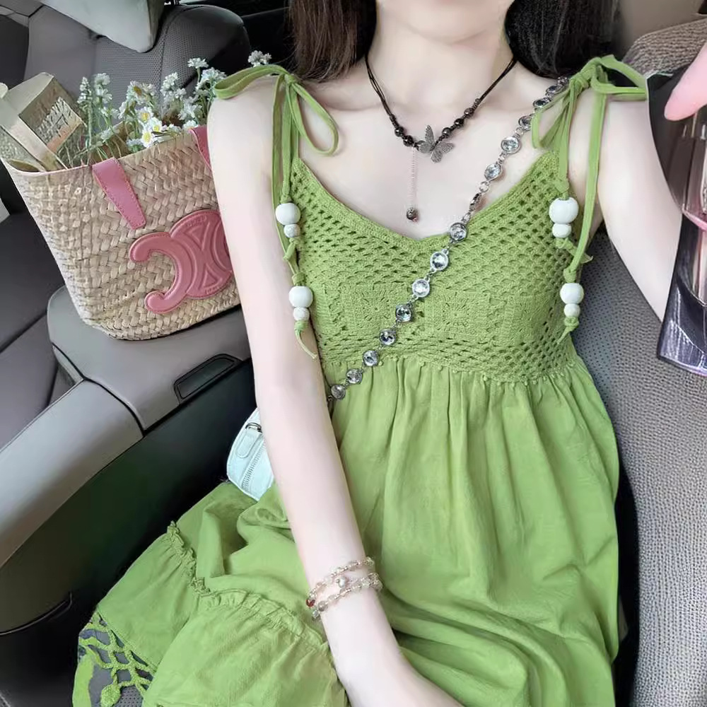 森系清新緑フリンジストラップワンピース夏新作ボヘミアン風デザイン感リゾートスカート女