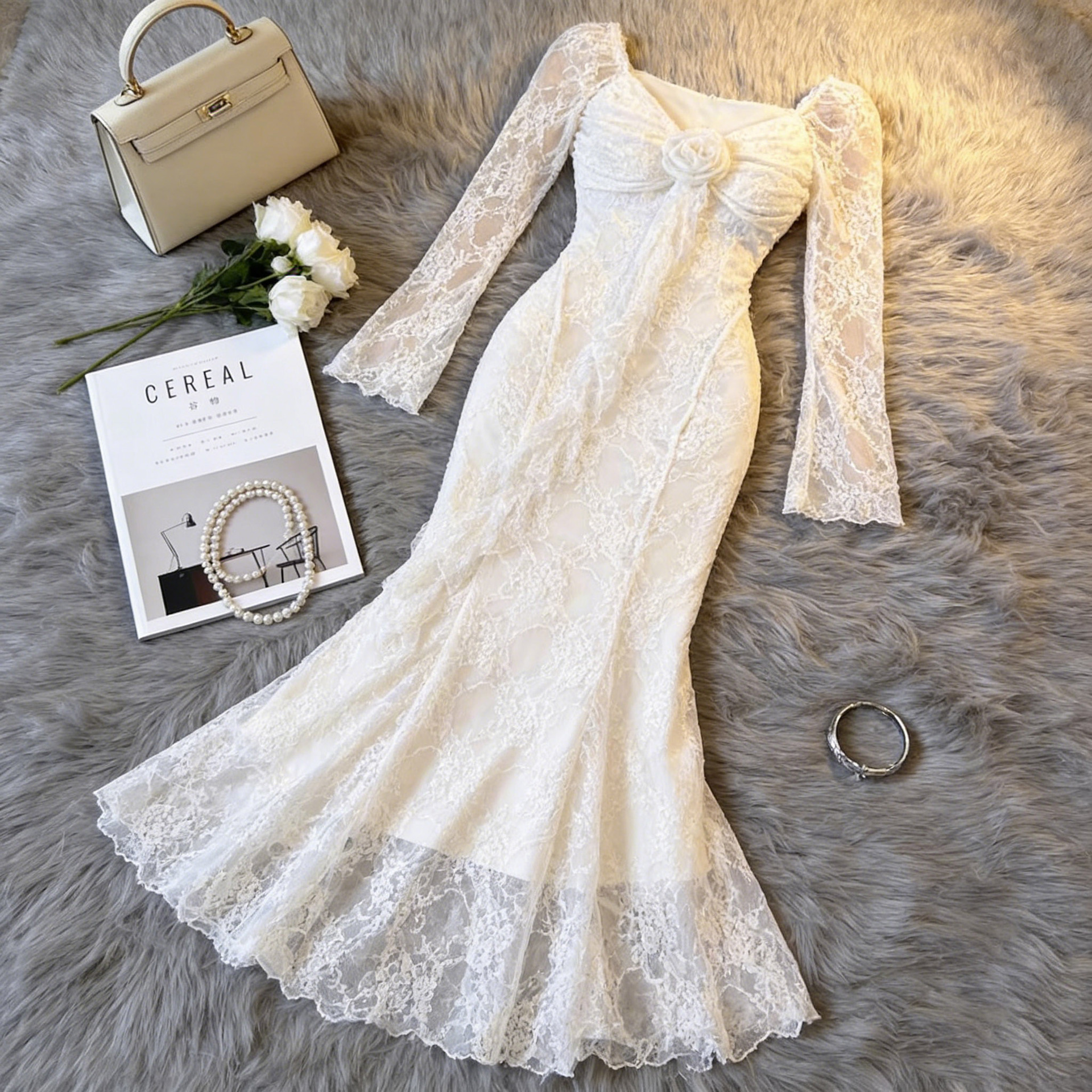 法式立体花朵飘带长袖时尚连衣裙女纯欲风蕾丝收腰显瘦鱼尾中长裙