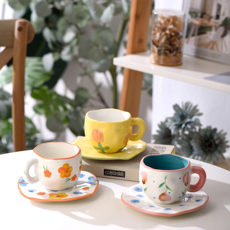 手绘小众设计感手捏釉下彩陶瓷杯碟高颜值女生田园风咖啡杯碟套装