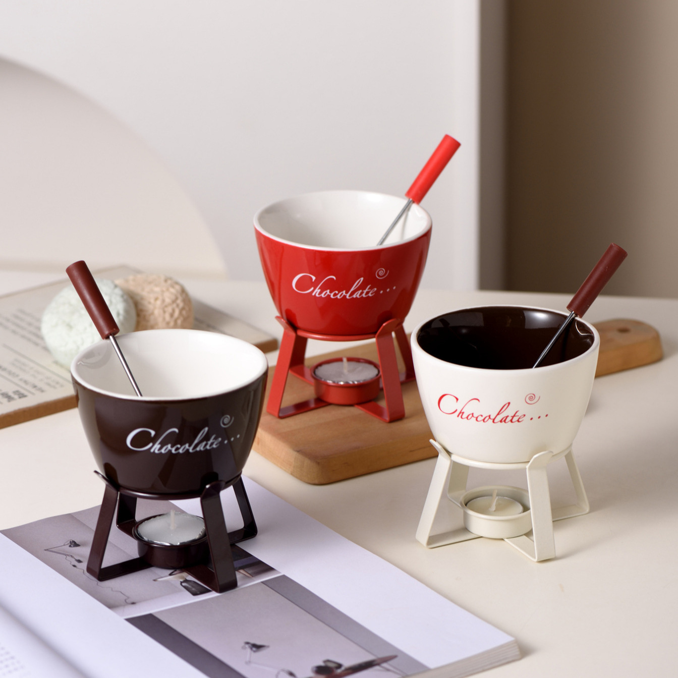 欧式瑞士冰淇淋起司芝士巧克力融化炉红色陶瓷氛围火锅杯带叉