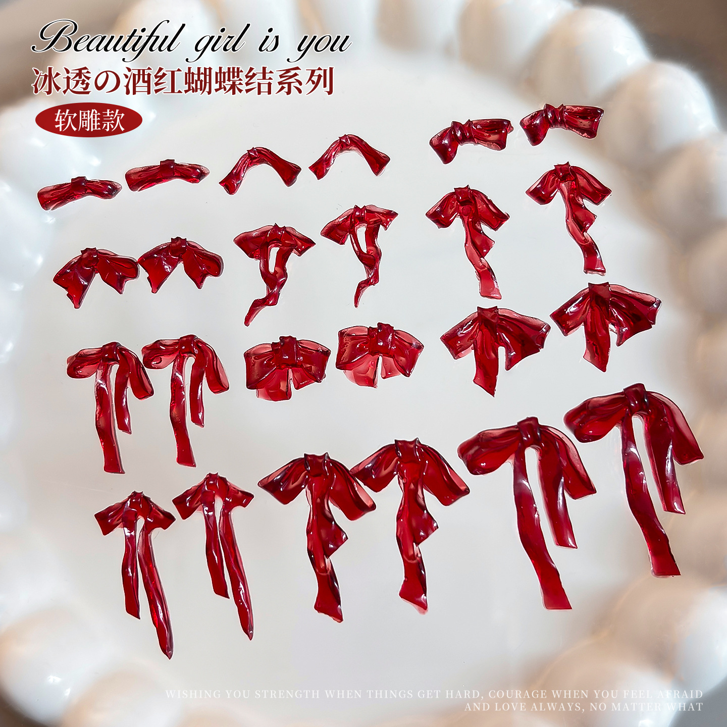 新年软雕酒红蝴蝶结美甲饰品网红爆款法式冰透飘带立体领结指甲钻