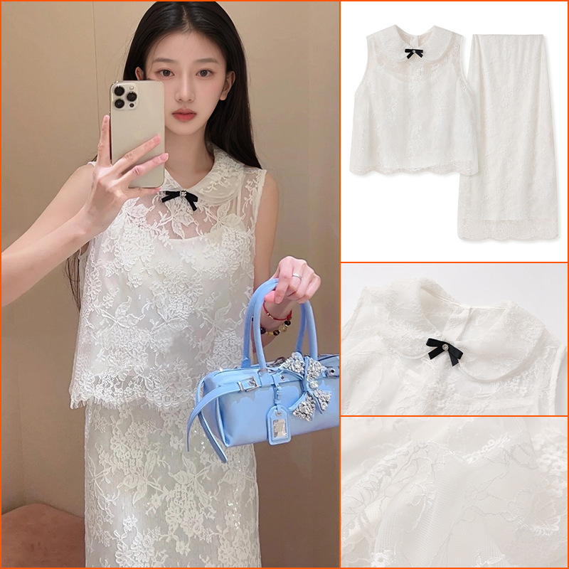おしゃれでエレガントなツーピースセット 夏らしい雰囲気のレースデザインスカート 高級感のあるドールカラーベスト ZXモデルN4029